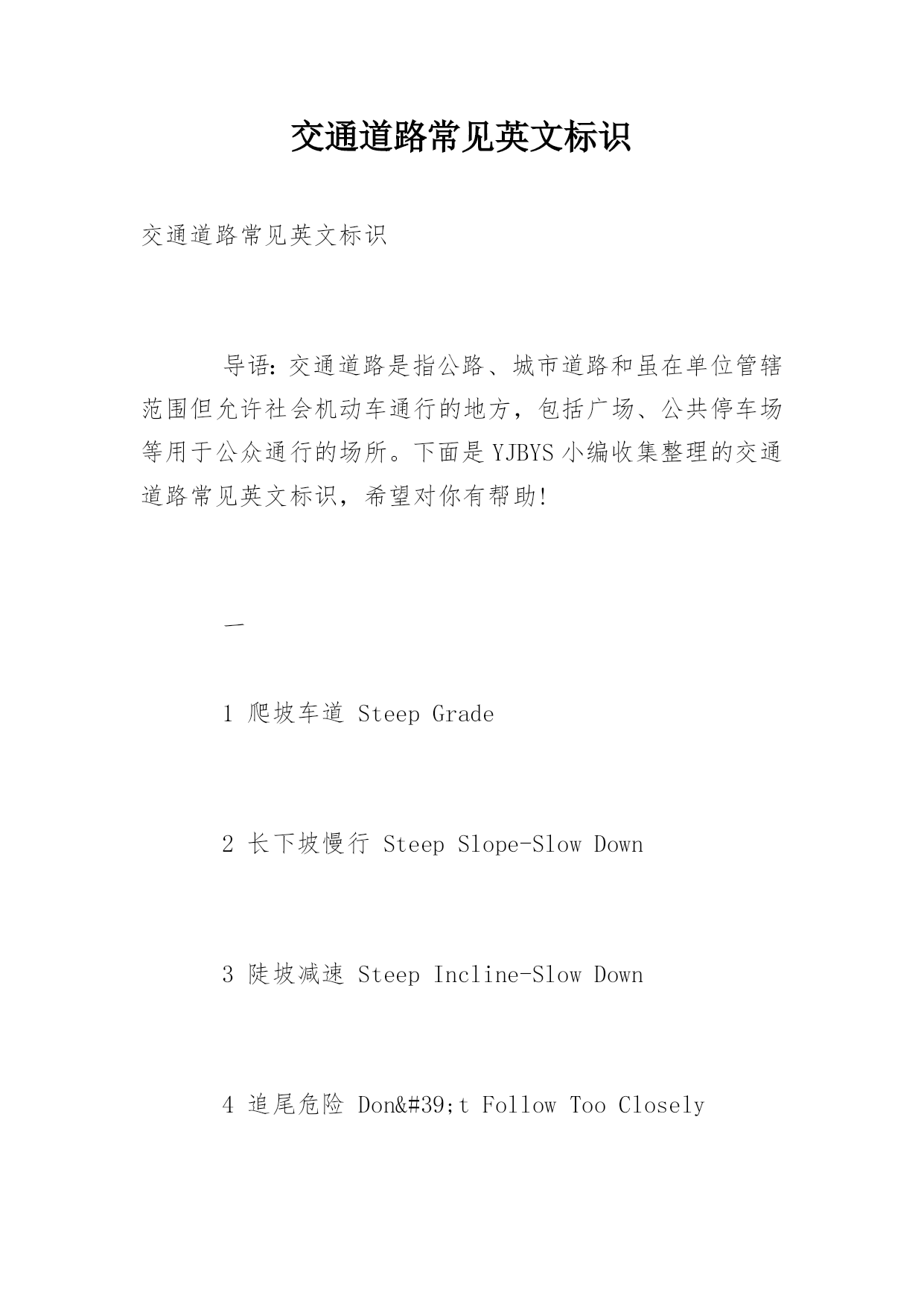 交通道路常见英文标识交通道路常见英文标识导语:交通道路是指公路、城市道路和虽在单位管辖范围但允许社会机动车通行的地方,包括广场、公共停车场等用于公众通行的场所。下面是YJBYS小编收集整理的交通道路常见英文标识,希望对你有帮助!一1爬坡车道SteepGrade2长下坡慢行SteepSlope-SlowDown3陡坡减速SteepIncline-SlowDown4追尾危险Don'tFollowTooClosely5小心路滑SlipperyWhenWet6保持车距MaintainSafeDistanc