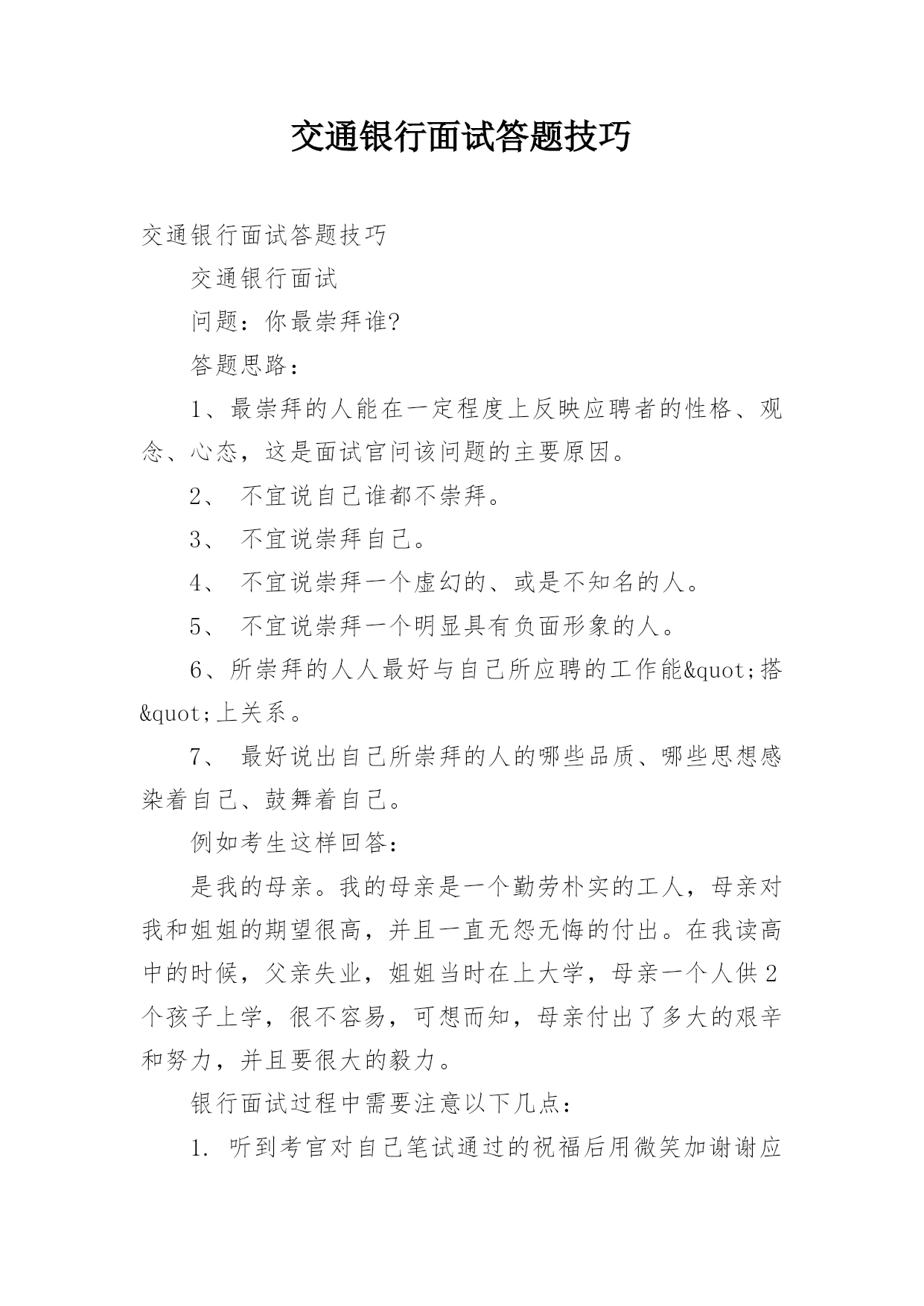 交通银行面试答题技巧交通银行面试答题技巧交通银行面试问题:你最崇拜谁?答题思路:1、最崇拜的人能在一定程度上反映应聘者的性格、观念、心态,这是面试官问该问题的主要原因。2、不宜说自己谁都不崇拜。3、不宜说崇拜自己。4、不宜说崇拜一个虚幻的、或是不知名的人。5、不宜说崇拜一个明显具有负面形象的人。6、所崇拜的人人最好与自己所应聘的工作能"搭"上关系。7、最好说出自己所崇拜的人的哪些品质、哪些思想感染着自己、鼓舞着自己。例如考生这样回答:是我的母亲。我的母亲是一个勤劳朴实的工人,母亲对我和