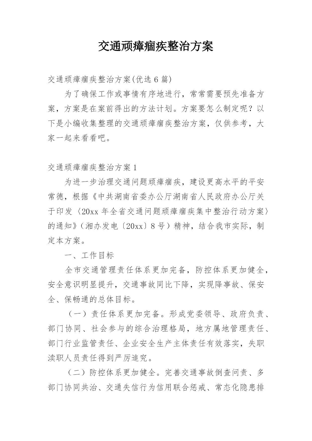 交通顽瘴痼疾整治方案交通顽瘴痼疾整治方案(优选6篇)为了确保工作或事情有序地进行,常常需要预先准备方案,方案是在案前得出的方法计划。方案要怎么制定呢?以下是小编收集整理的交通顽瘴痼疾整治方案,仅供参考,大家一起来看看吧。交通顽瘴痼疾整治方案1为进一步治理交通问题顽瘴痼疾,建设更高水平的平安常德,根据《中共湖南省委办公厅湖南省人民政府办公厅关于印发〈20xx年全省交通问题顽瘴痼疾集中整治行动方案〉的通知》(湘办发电〔20xx〕8号)精神,结合我市实际,制定本方案。一、工作目标全市交通管理责任体系更加完备,防