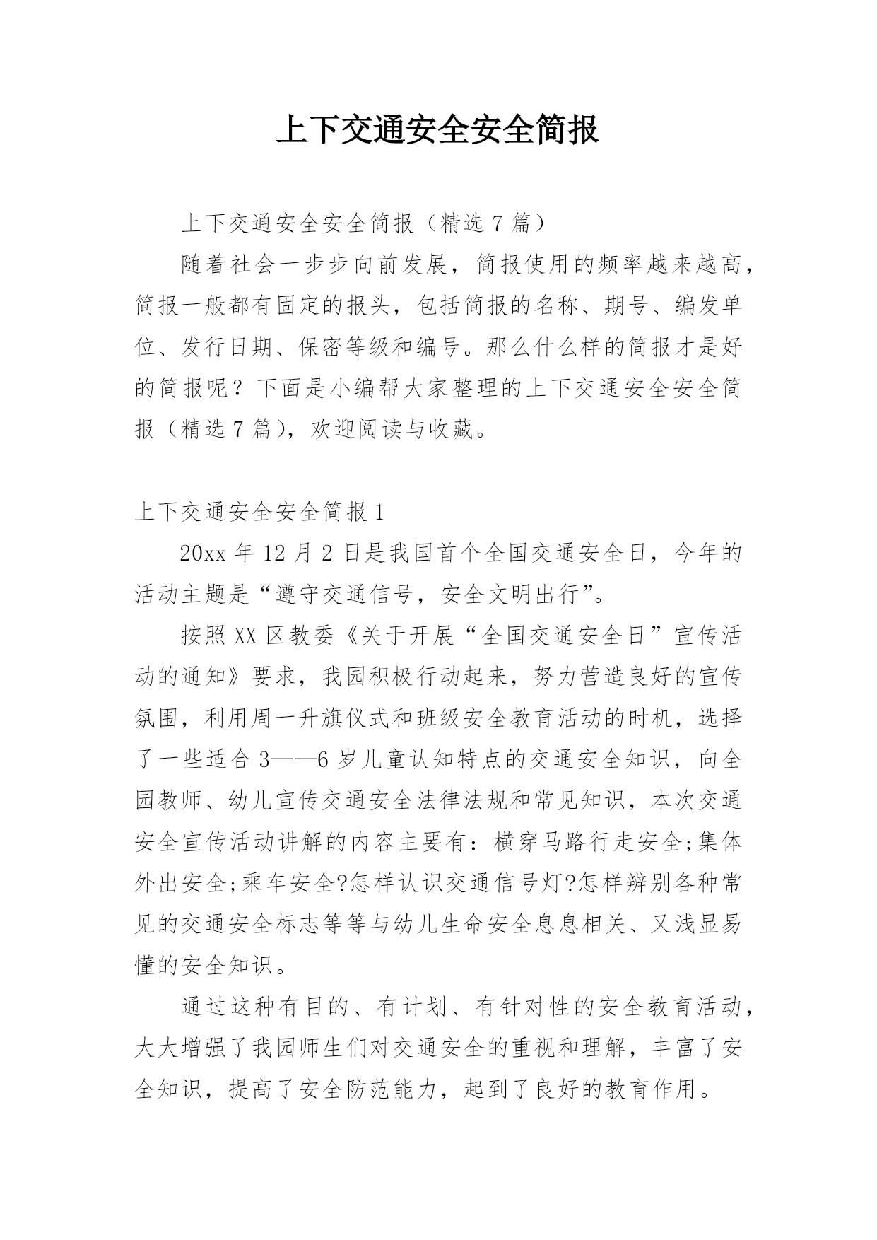 上下交通安全安全简报上下交通安全安全简报(精选7篇)随着社会一步步向前发展,简报使用的频率越来越高,简报一般都有固定的报头,包括简报的名称、期号、编发单位、发行日期、保密等级和编号。那么什么样的简报才是好的简报呢?下面是小编帮大家整理的上下交通安全安全简报(精选7篇),欢迎阅读与收藏。上下交通安全安全简报120xx年12月2日是我国首个全国交通安全日,今年的活动主题是“遵守交通信号,安全文明出行”。按照XX区教委《关于开展“全国交通安全日”宣传活动的通知》要求,我园积极行动起来,努力营造良好的宣传氛围,利