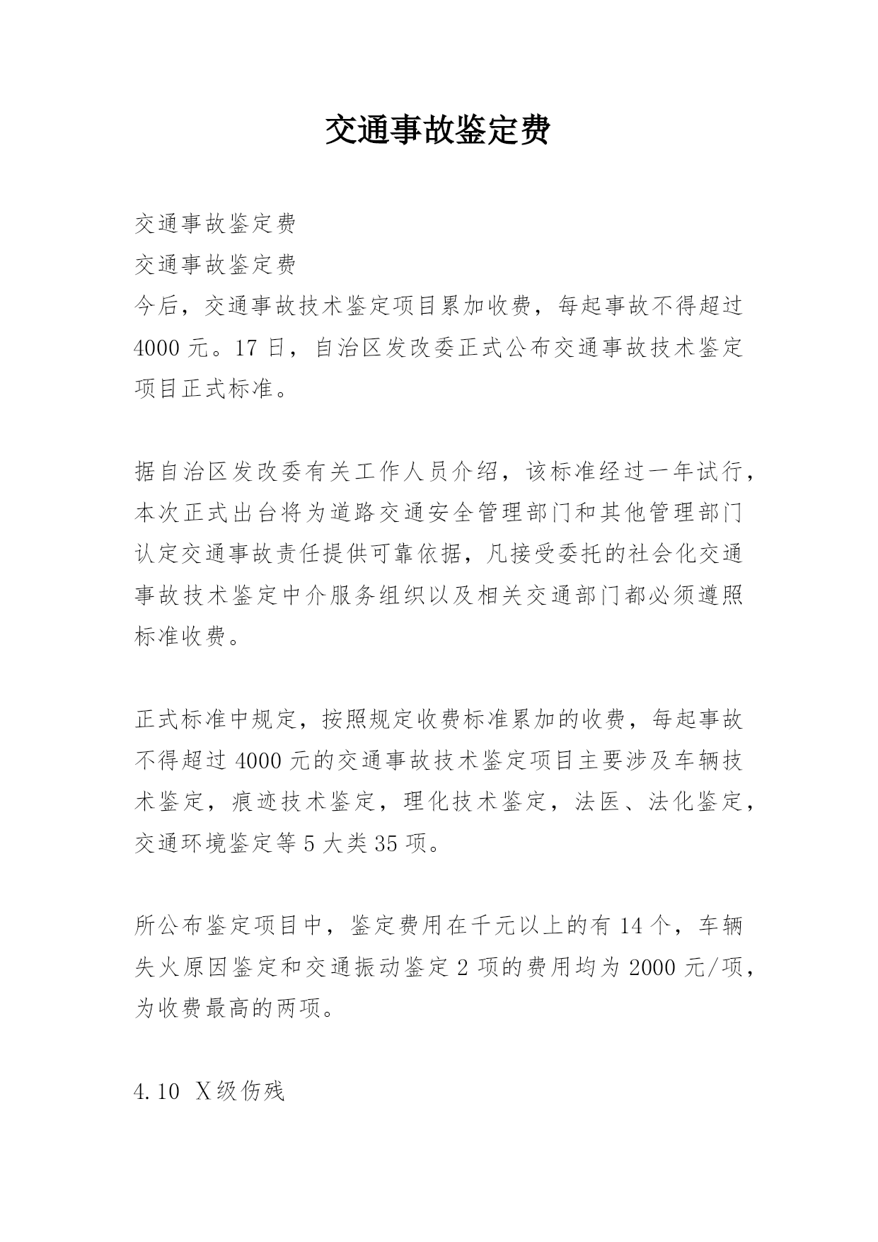 交通事故鉴定费交通事故鉴定费交通事故鉴定费今后,交通事故技术鉴定项目累加收费,每起事故不得超过4000元。17日,自治区发改委正式公布交通事故技术鉴定项目正式标准。据自治区发改委有关工作人员介绍,该标准经过一年试行,本次正式出台将为道路交通安全管理部门和其他管理部门认定交通事故责任提供可靠依据,凡接受委托的社会化交通事故技术鉴定中介服务组织以及相关交通部门都必须遵照标准收费。正式标准中规定,按照规定收费标准累加的收费,每起事故不得超过4000元的交通事故技术鉴定项目主要涉及车辆技术鉴定,痕迹技术鉴定,理化