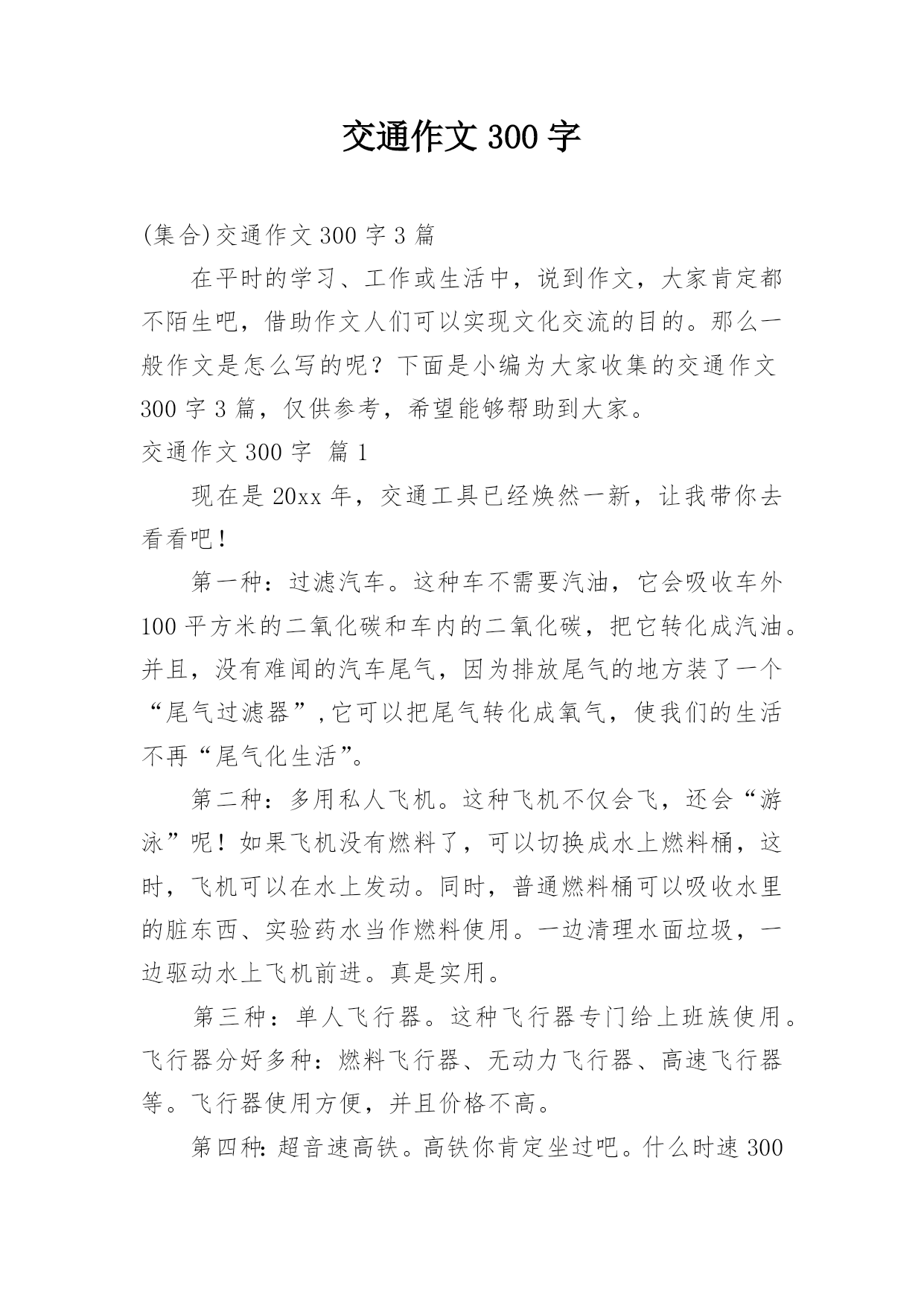 交通作文300字(集合)交通作文300字3篇在平时的学习、工作或生活中,说到作文,大家肯定都不陌生吧,借助作文人们可以实现文化交流的目的。那么一般作文是怎么写的呢?下面是小编为大家收集的交通作文300字3篇,仅供参考,希望能够帮助到大家。交通作文300字篇1现在是20xx年,交通工具已经焕然一新,让我带你去看看吧!第一种:过滤汽车。这种车不需要汽油,它会吸收车外100平方米的二氧化碳和车内的二氧化碳,把它转化成汽油。并且,没有难闻的汽车尾气,因为排放尾气的地方装了一个“尾气过滤器”,它可以把尾气转化成氧气
