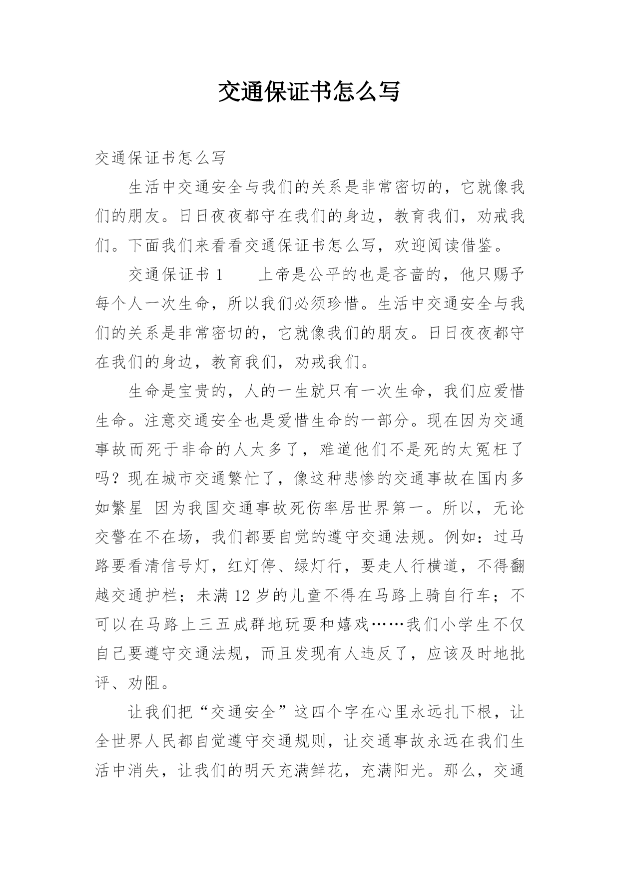 交通保证书怎么写交通保证书怎么写生活中交通安全与我们的关系是非常密切的,它就像我们的朋友。日日夜夜都守在我们的身边,教育我们,劝戒我们。下面我们来看看交通保证书怎么写,欢迎阅读借鉴。交通保证书1上帝是公平的也是吝啬的,他只赐予每个人一次生命,所以我们必须珍惜。生活中交通安全与我们的关系是非常密切的,它就像我们的朋友。日日夜夜都守在我们的身边,教育我们,劝戒我们。生命是宝贵的,人的一生就只有一次生命,我们应爱惜生命。注意交通安全也是爱惜生命的一部分。现在因为交通事故而死于非命的人太多了,难道他们不是死的太冤