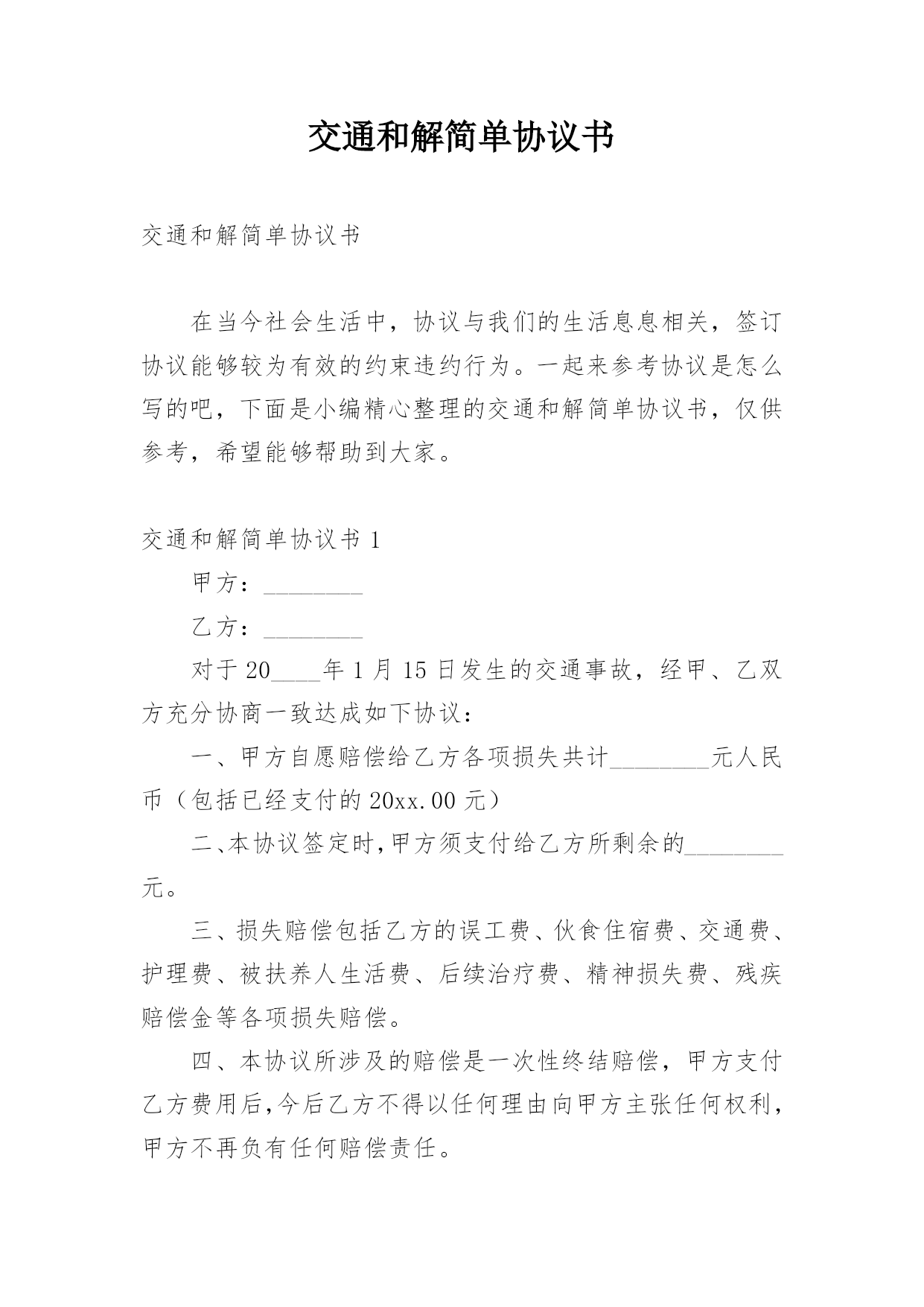 交通和解简单协议书交通和解简单协议书在当今社会生活中,协议与我们的生活息息相关,签订协议能够较为有效的约束违约行为。一起来参考协议是怎么写的吧,下面是小编精心整理的交通和解简单协议书,仅供参考,希望能够帮助到大家。交通和解简单协议书1甲方:________乙方:________对于20____年1月15日发生的交通事故,经甲、乙双方充分协商一致达成如下协议:一、甲方自愿赔偿给乙方各项损失共计________元人民币(包括已经支付的20xx.00元)二、本协议签定时,甲方须支付给乙方所剩余的________