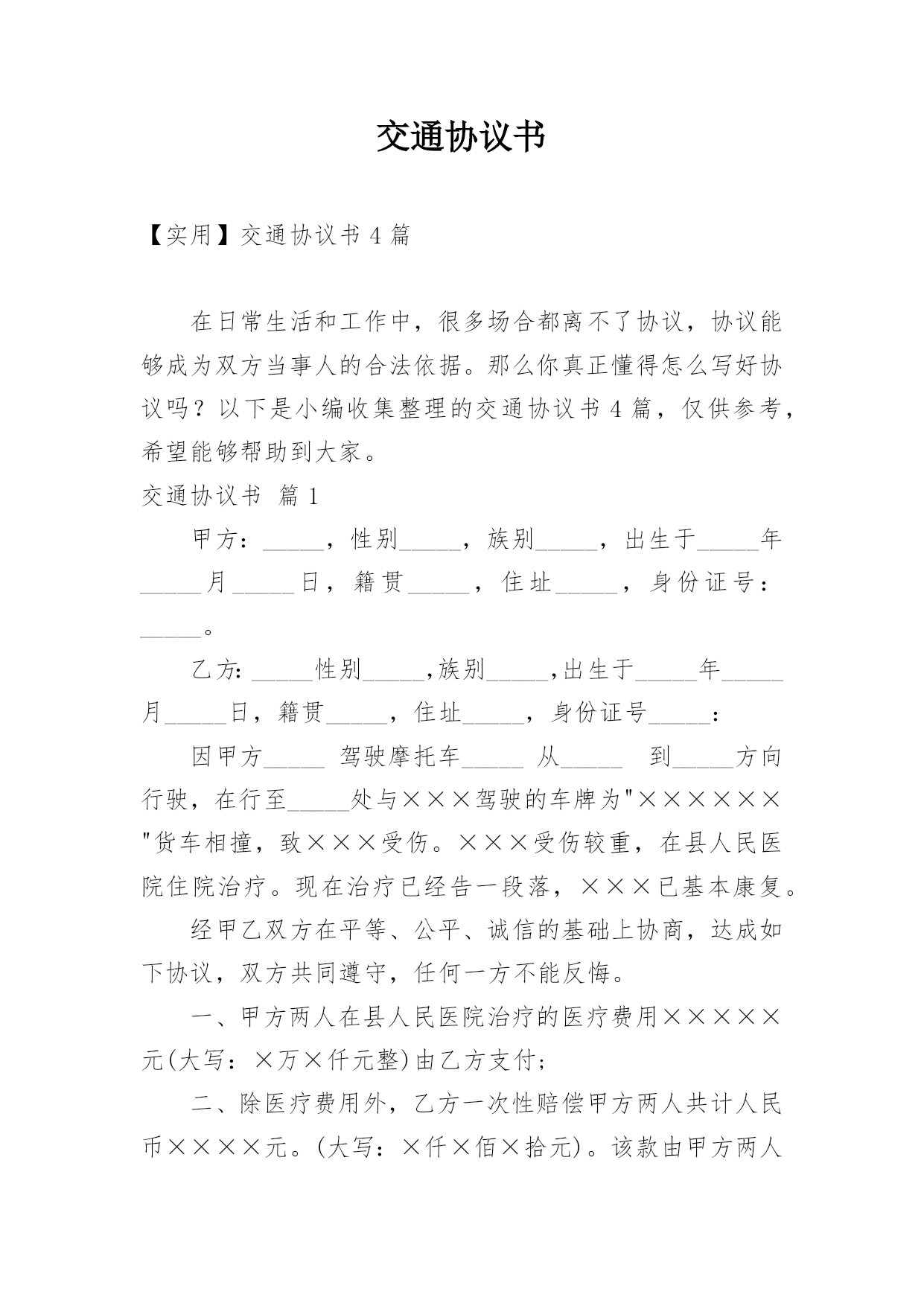交通协议书【实用】交通协议书4篇在日常生活和工作中,很多场合都离不了协议,协议能够成为双方当事人的合法依据。那么你真正懂得怎么写好协议吗?以下是小编收集整理的交通协议书4篇,仅供参考,希望能够帮助到大家。交通协议书篇1甲方:_____,性别_____,族别_____,出生于_____年_____月_____日,籍贯_____,住址_____,身份证号:_____。乙方:_____性别_____,族别_____,出生于_____年_____月_____日,籍贯_____,住址_____,身份证号_____: