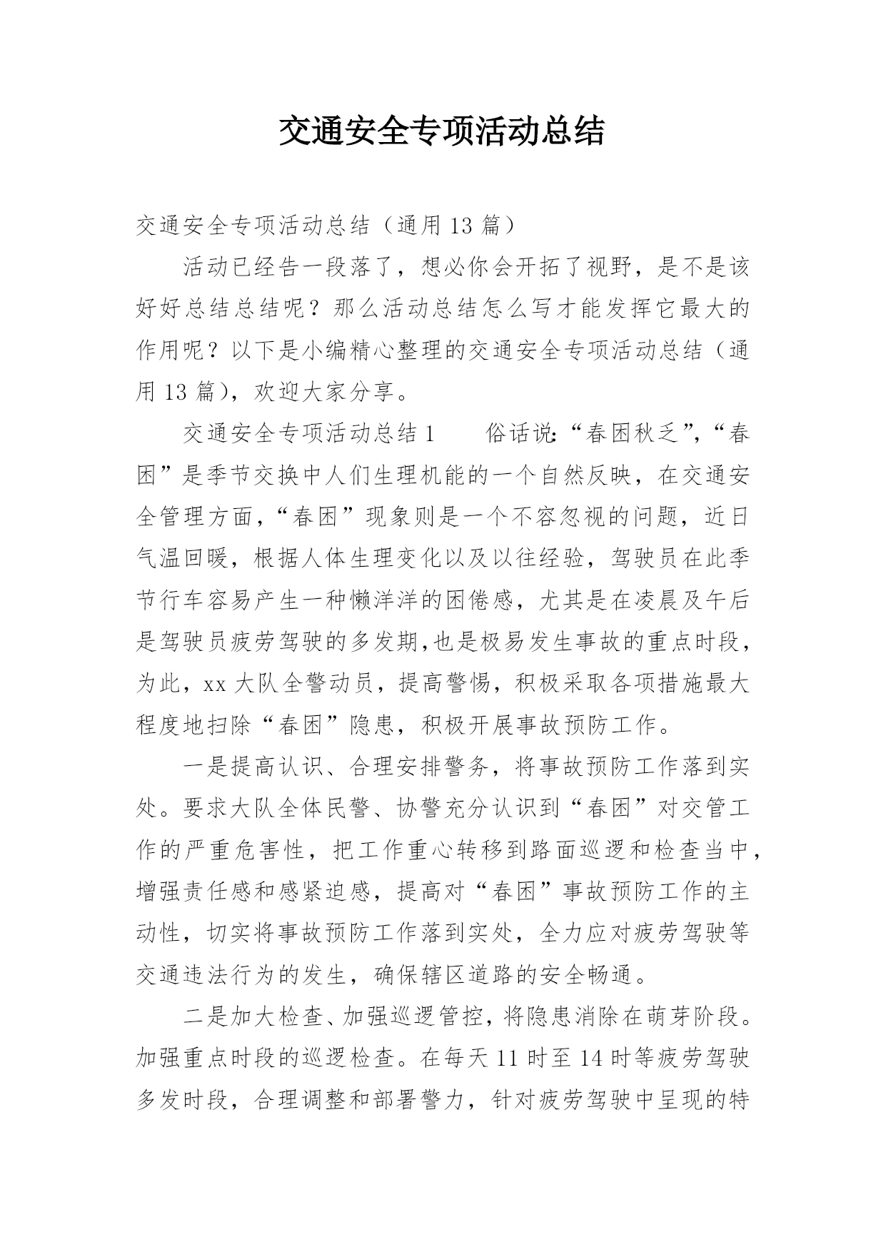 交通安全专项活动总结交通安全专项活动总结(通用13篇)活动已经告一段落了,想必你会开拓了视野,是不是该好好总结总结呢?那么活动总结怎么写才能发挥它最大的作用呢?以下是小编精心整理的交通安全专项活动总结(通用13篇),欢迎大家分享。交通安全专项活动总结1俗话说:“春困秋乏”,“春困”是季节交换中人们生理机能的一个自然反映,在交通安全管理方面,“春困”现象则是一个不容忽视的问题,近日气温回暖,根据人体生理变化以及以往经验,驾驶员在此季节行车容易产生一种懒洋洋的困倦感,尤其是在凌晨及午后是驾驶员疲劳驾驶的多发期