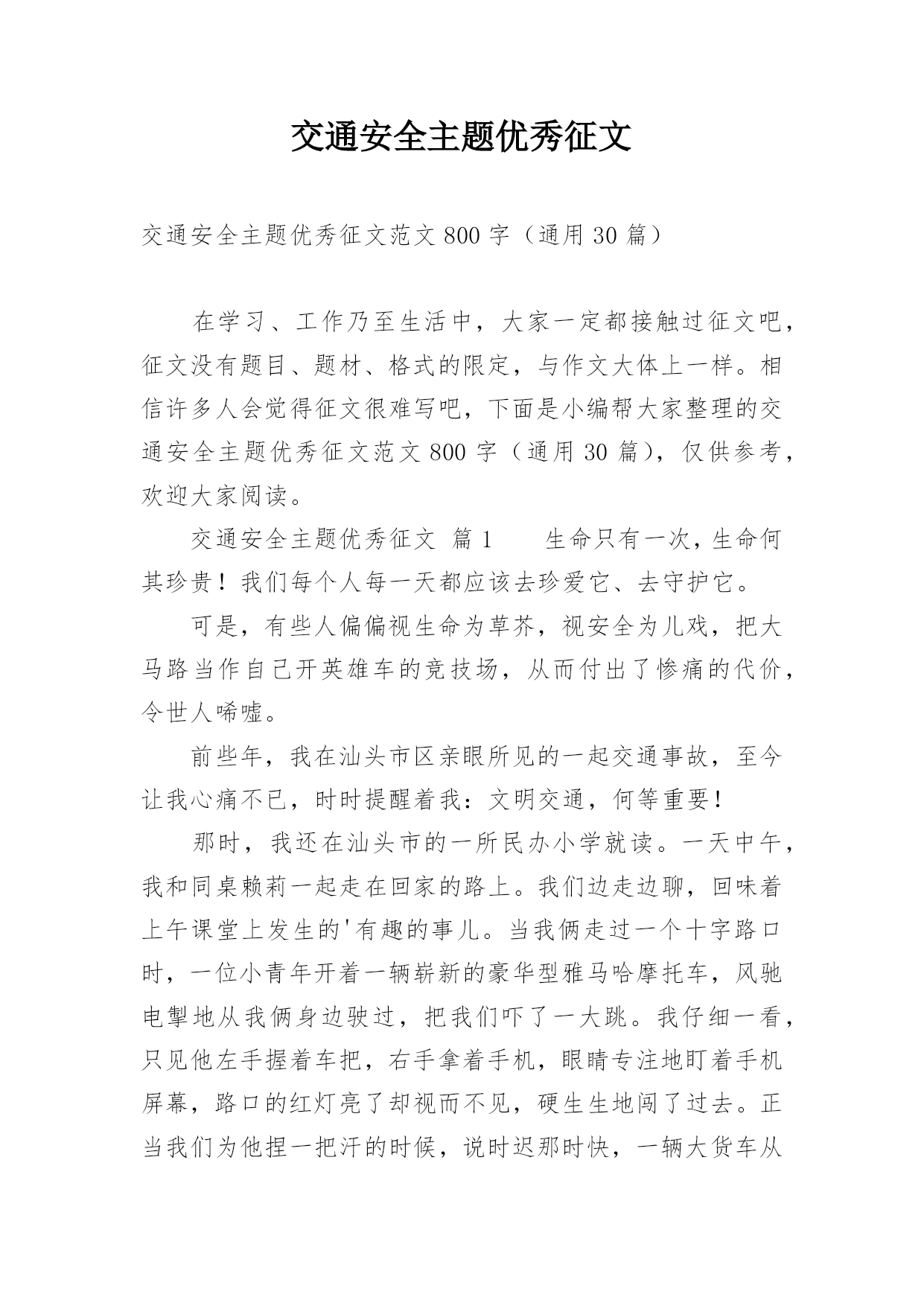 交通安全主题优秀征文交通安全主题优秀征文范文800字(通用30篇)在学习、工作乃至生活中,大家一定都接触过征文吧,征文没有题目、题材、格式的限定,与作文大体上一样。相信许多人会觉得征文很难写吧,下面是小编帮大家整理的交通安全主题优秀征文范文800字(通用30篇),仅供参考,欢迎大家阅读。交通安全主题优秀征文篇1生命只有一次,生命何其珍贵!我们每个人每一天都应该去珍爱它、去守护它。可是,有些人偏偏视生命为草芥,视安全为儿戏,把大马路当作自己开英雄车的竞技场,从而付出了惨痛的代价,令世人唏嘘。前些年,我在汕头