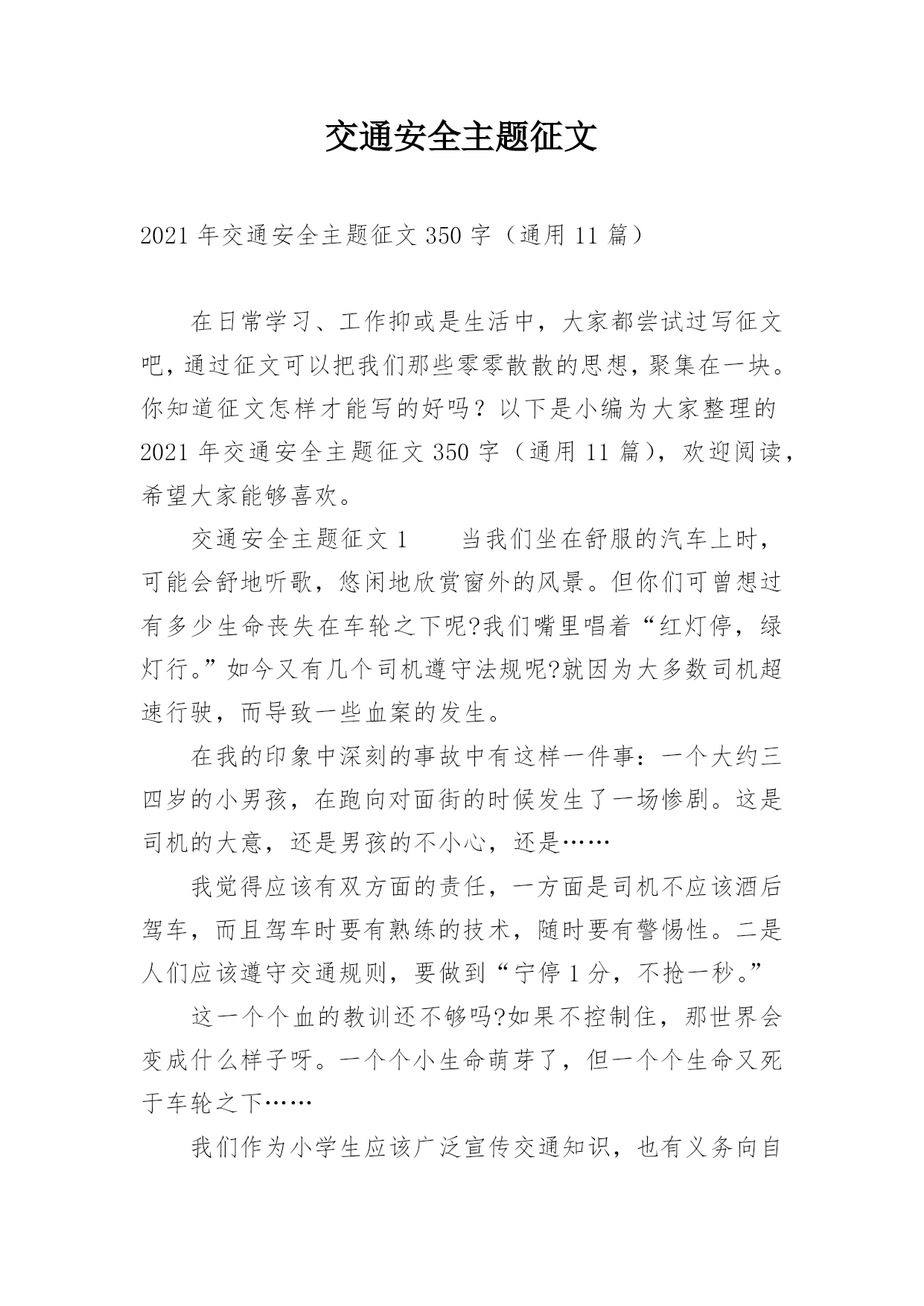 交通安全主题征文2021年交通安全主题征文350字(通用11篇)在日常学习、工作抑或是生活中,大家都尝试过写征文吧,通过征文可以把我们那些零零散散的思想,聚集在一块。你知道征文怎样才能写的好吗?以下是小编为大家整理的2021年交通安全主题征文350字(通用11篇),欢迎阅读,希望大家能够喜欢。交通安全主题征文1当我们坐在舒服的汽车上时,可能会舒地听歌,悠闲地欣赏窗外的风景。但你们可曾想过有多少生命丧失在车轮之下呢?我们嘴里唱着“红灯停,绿灯行。”如今又有几个司机遵守法规呢?就因为大多数司机超速行驶,而导致