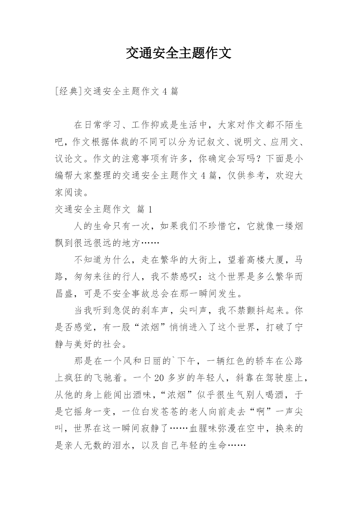 交通安全主题作文[经典]交通安全主题作文4篇在日常学习、工作抑或是生活中,大家对作文都不陌生吧,作文根据体裁的不同可以分为记叙文、说明文、应用文、议论文。作文的注意事项有许多,你确定会写吗?下面是小编帮大家整理的交通安全主题作文4篇,仅供参考,欢迎大家阅读。交通安全主题作文篇1人的生命只有一次,如果我们不珍惜它,它就像一缕烟飘到很远很远的地方……不知道为什么,走在繁华的大街上,望着高楼大厦,马路,匆匆来往的行人,我不禁感叹:这个世界是多么繁华而昌盛,可是不安全事故总会在那一瞬间发生。当我听到急促的刹车声,