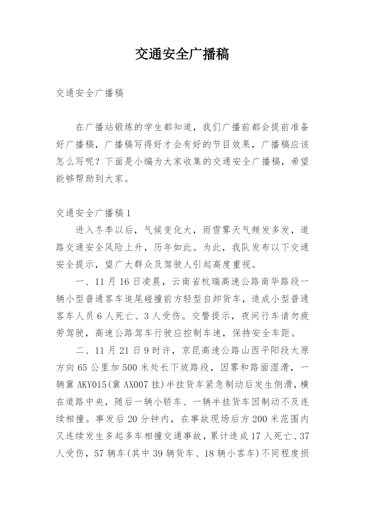 交通安全广播稿交通安全广播稿在广播站锻炼的学生都知道,我们广播前都会提前准备好广播稿,广播稿写得好才会有好的节目效果,广播稿应该怎么写呢?下面是小编为大家收集的交通安全广播稿,希望能够帮助到大家。交通安全广播稿1进入冬季以后,气候变化大,雨雪雾天气频发多发,道路交通安全风险上升,历年如此。为此,我队发布以下交通安全提示,望广大群众及驾驶人引起高度重视。一、11月16日凌晨,云南省杭瑞高速公路南华路段一辆小型普通客车追尾碰撞前方轻型自卸货车,造成小型普通客车人员6人死亡、3人受伤。交警提示,夜间行车请勿疲劳