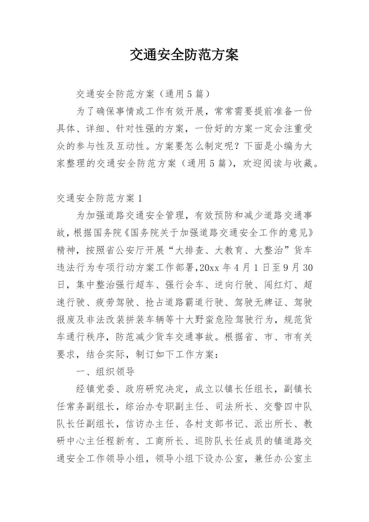 交通安全防范方案交通安全防范方案(通用5篇)为了确保事情或工作有效开展,常常需要提前准备一份具体、详细、针对性强的方案,一份好的方案一定会注重受众的参与性及互动性。方案要怎么制定呢?下面是小编为大家整理的交通安全防范方案(通用5篇),欢迎阅读与收藏。交通安全防范方案1为加强道路交通安全管理,有效预防和减少道路交通事故,根据国务院《国务院关于加强道路交通安全工作的意见》精神,按照省公安厅开展“大排查、大教育、大整治”货车违法行为专项行动方案工作部署,20xx年4月1日至9月30日,集中整治强行超车、强行会车