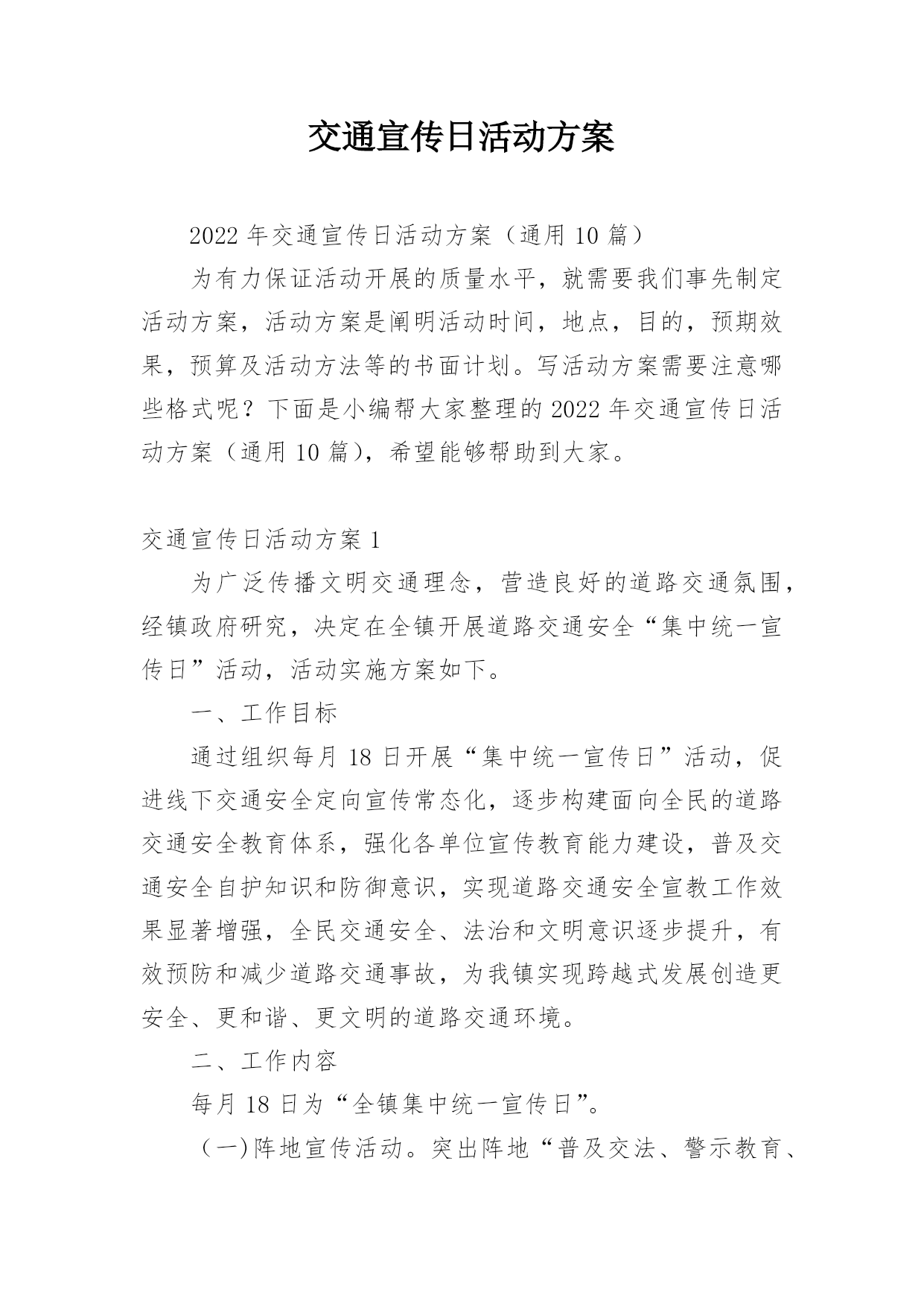 交通宣传日活动方案2022年交通宣传日活动方案(通用10篇)为有力保证活动开展的质量水平,就需要我们事先制定活动方案,活动方案是阐明活动时间,地点,目的,预期效果,预算及活动方法等的书面计划。写活动方案需要注意哪些格式呢?下面是小编帮大家整理的2022年交通宣传日活动方案(通用10篇),希望能够帮助到大家。交通宣传日活动方案1为广泛传播文明交通理念,营造良好的道路交通氛围,经镇政府研究,决定在全镇开展道路交通安全“集中统一宣传日”活动,活动实施方案如下。一、工作目标通过组织每月18日开展“集中统一宣传日”