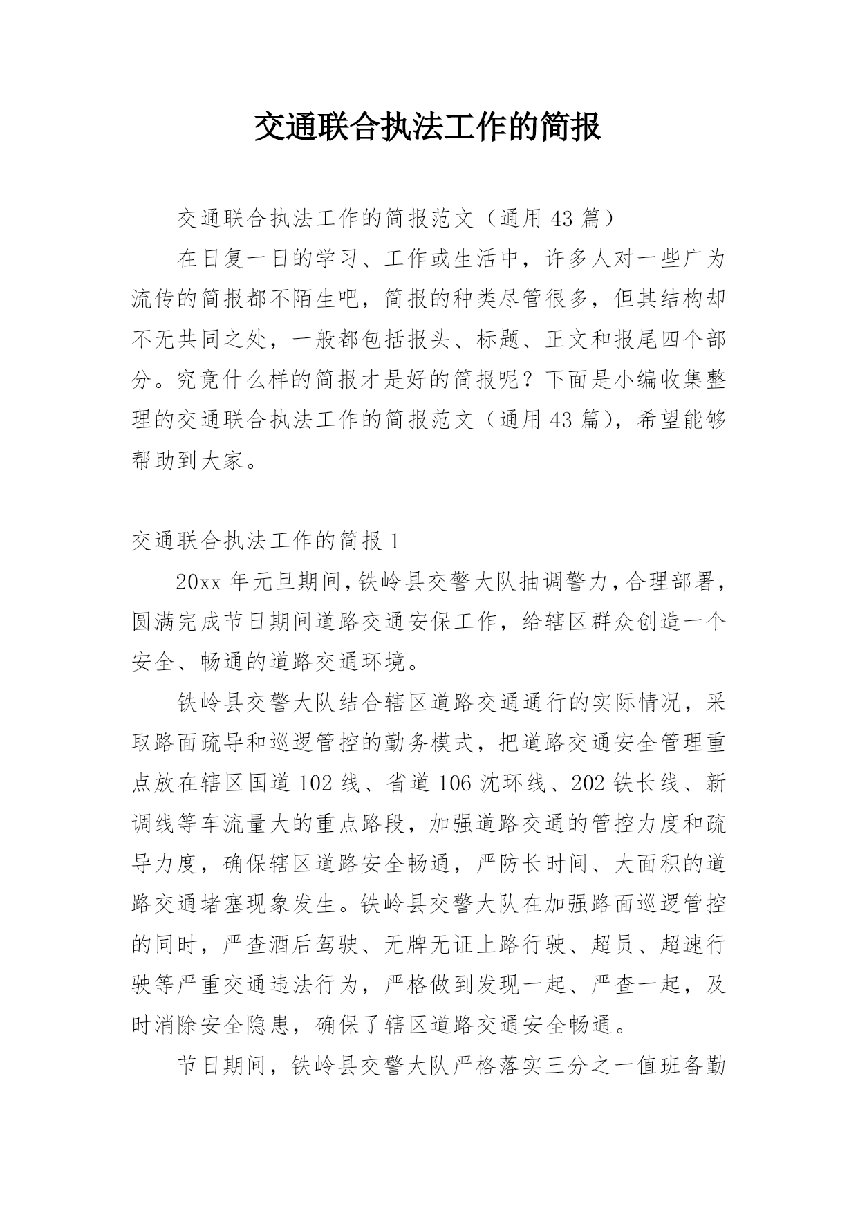 交通联合执法工作的简报交通联合执法工作的简报范文(通用43篇)在日复一日的学习、工作或生活中,许多人对一些广为流传的简报都不陌生吧,简报的种类尽管很多,但其结构却不无共同之处,一般都包括报头、标题、正文和报尾四个部分。究竟什么样的简报才是好的简报呢?下面是小编收集整理的交通联合执法工作的简报范文(通用43篇),希望能够帮助到大家。交通联合执法工作的简报120xx年元旦期间,铁岭县交警大队抽调警力,合理部署,圆满完成节日期间道路交通安保工作,给辖区群众创造一个安全、畅通的道路交通环境。铁岭县交警大队结合辖区