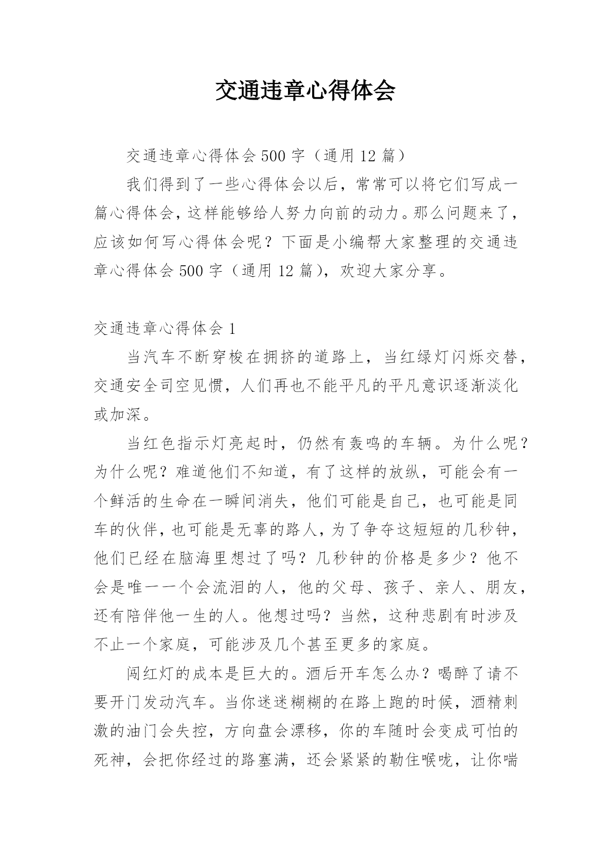 交通违章心得体会交通违章心得体会500字(通用12篇)我们得到了一些心得体会以后,常常可以将它们写成一篇心得体会,这样能够给人努力向前的动力。那么问题来了,应该如何写心得体会呢?下面是小编帮大家整理的交通违章心得体会500字(通用12篇),欢迎大家分享。交通违章心得体会1当汽车不断穿梭在拥挤的道路上,当红绿灯闪烁交替,交通安全司空见惯,人们再也不能平凡的平凡意识逐渐淡化或加深。当红色指示灯亮起时,仍然有轰鸣的车辆。为什么呢?为什么呢?难道他们不知道,有了这样的放纵,可能会有一个鲜活的生命在一瞬间消失,他们