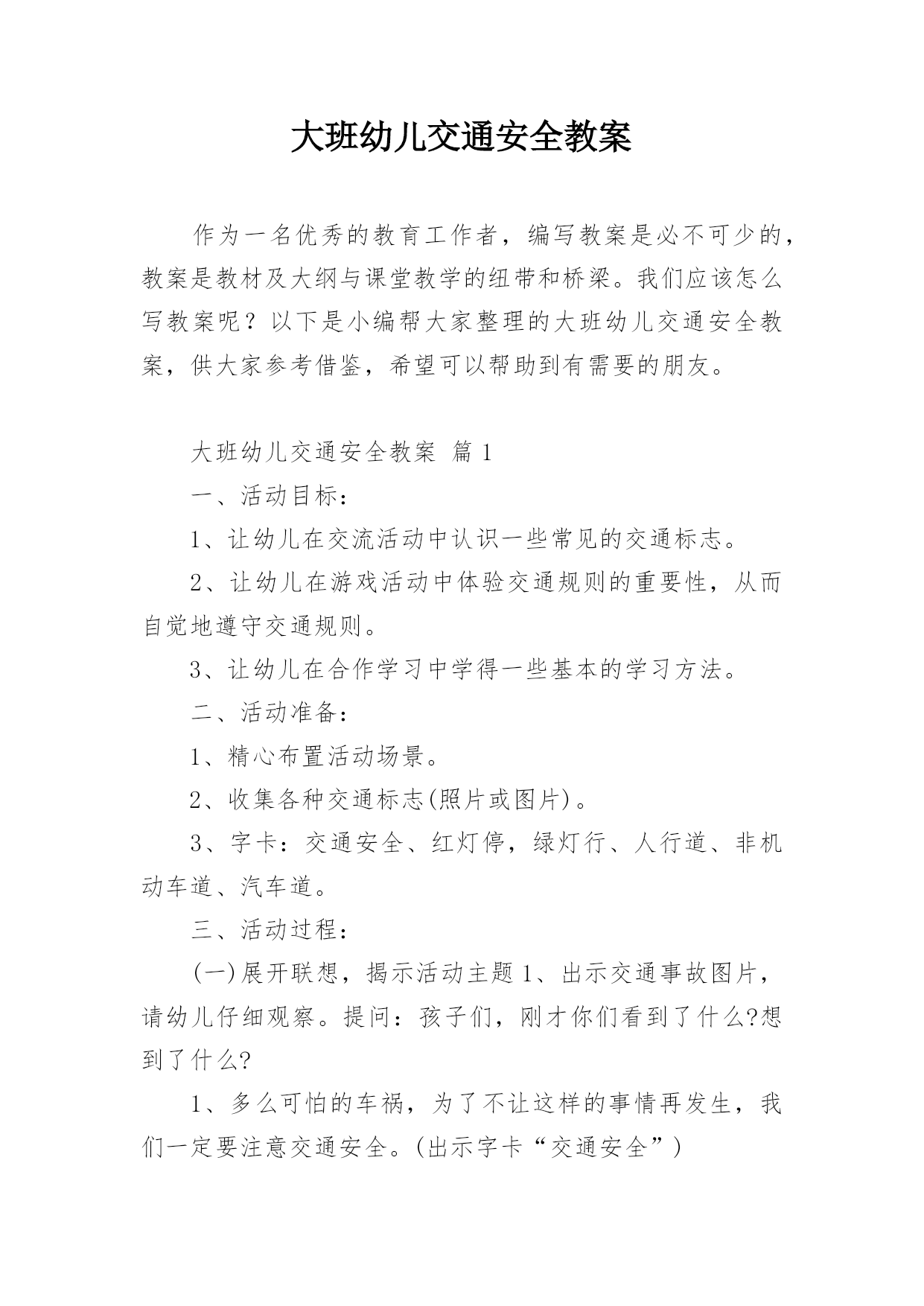 大班幼儿交通安全教案作为一名优秀的教育工作者,编写教案是必不可少的,教案是教材及大纲与课堂教学的纽带和桥梁。我们应该怎么写教案呢?以下是小编帮大家整理的大班幼儿交通安全教案,供大家参考借鉴,希望可以帮助到有需要的朋友。大班幼儿交通安全教案篇1一、活动目标:1、让幼儿在交流活动中认识一些常见的交通标志。2、让幼儿在游戏活动中体验交通规则的重要性,从而自觉地遵守交通规则。3、让幼儿在合作学习中学得一些基本的学习方法。二、活动准备:1、精心布置活动场景。2、收集各种交通标志(照片或图片)。3、字卡:交通安全、红