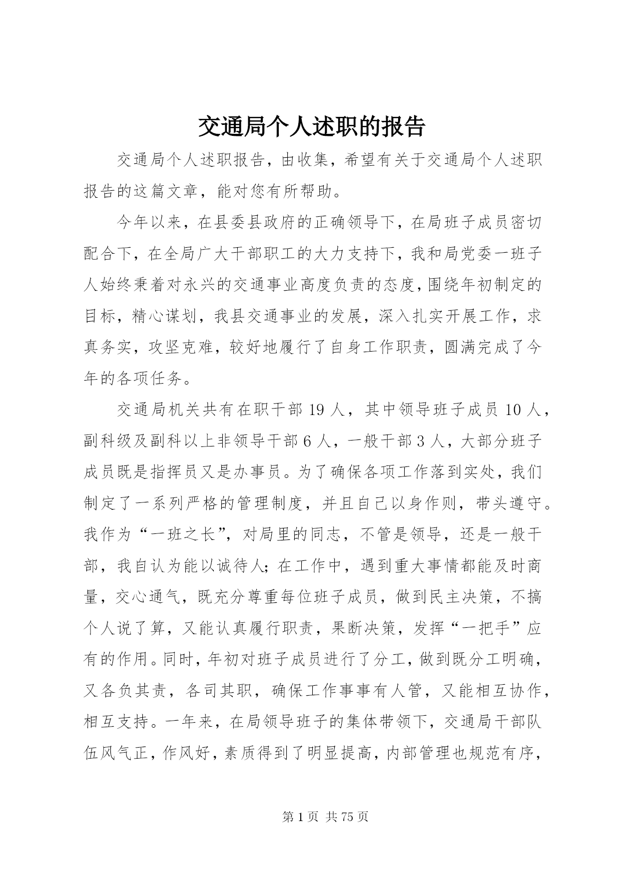 第PAGE\*Arabic\*MERGEFORMAT75页共NUMPAGES\*MERGEFORMAT75页交通局个人述职的报告交通局个人述职报告,由收集,希望有关于交通局个人述职报告的这篇文章,能对您有所帮助。今年以来,在县委县政府的正确领导下,在局班子成员密切配合下,在全局广大干部职工的大力支持下,我和局党委一班子人始终秉着对永兴的交通事业高度负责的态度,围绕年初制定的目标,精心谋划,我县交通事业的发展,深入扎实开展工作,求真务实,攻坚克难,较好地履行了自身工作职责,圆满完成了今年的各项任
