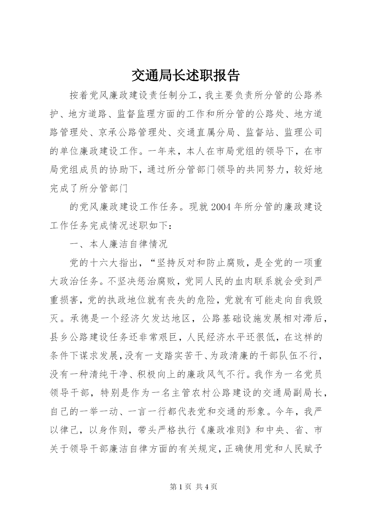 第PAGE\*Arabic\*MERGEFORMAT4页共NUMPAGES\*MERGEFORMAT4页交通局长述职报告按着党风廉政建设责任制分工,我主要负责所分管的公路养护、地方道路、监督监理方面的工作和所分管的公路处、地方道路管理处、京承公路管理处、交通直属分局、监督站、监理公司的单位廉政建设工作。一年来,本人在市局党组的领导下,在市局党组成员的协助下,通过所分管部门领导的共同努力,较好地完成了所分管部门的党风廉政建设工作任务。现就2004年所分管的廉政建设工作任务完成情况述职如下:一、本