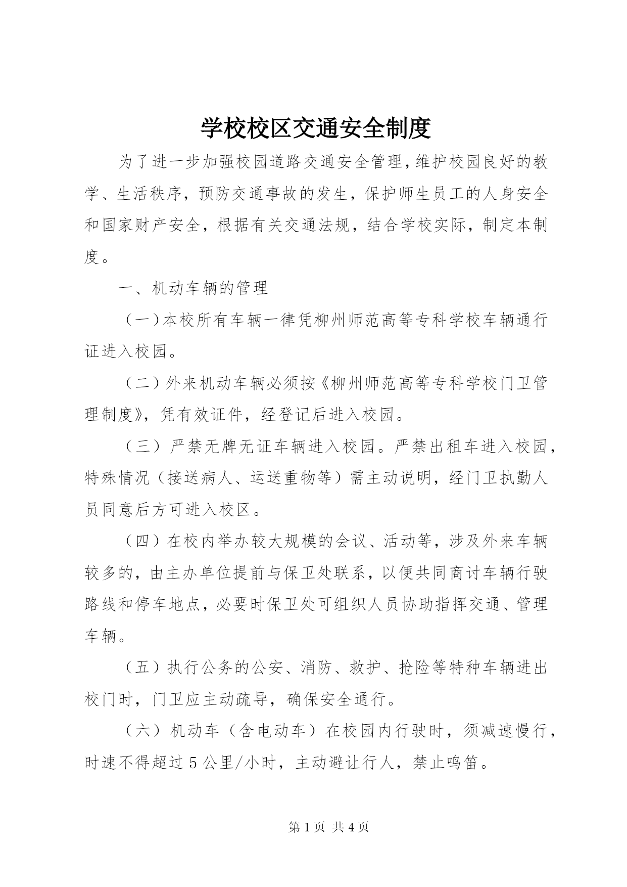 第PAGE\*Arabic\*MERGEFORMAT4页共NUMPAGES\*MERGEFORMAT4页学校校区交通安全制度为了进一步加强校园道路交通安全管理,维护校园良好的教学、生活秩序,预防交通事故的发生,保护师生员工的人身安全和国家财产安全,根据有关交通法规,结合学校实际,制定本制度。一、机动车辆的管理(一)本校所有车辆一律凭柳州师范高等专科学校车辆通行证进入校园。(二)外来机动车辆必须按《柳州师范高等专科学校门卫管理制度》,凭有效证件,经登记后进入校园。(三)严禁无牌无证车辆进入校园。