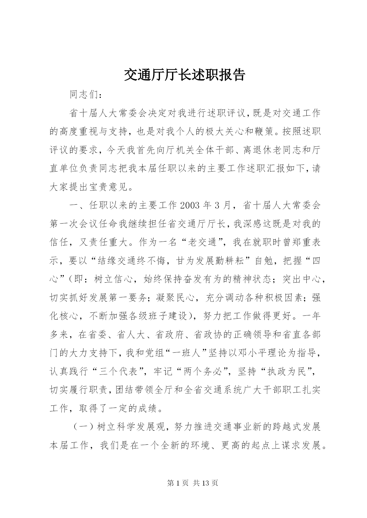 第PAGE\*Arabic\*MERGEFORMAT13页共NUMPAGES\*MERGEFORMAT13页交通厅厅长述职报告同志们:省十届人大常委会决定对我进行述职评议,既是对交通工作的高度重视与支持,也是对我个人的极大关心和鞭策。按照述职评议的要求,今天我首先向厅机关全体干部、离退休老同志和厅直单位负责同志把我本届任职以来的主要工作述职汇报如下,请大家提出宝贵意见。一、任职以来的主要工作2003年3月,省十届人大常委会第一次会议任命我继续担任省交通厅厅长,我深感这既是对我的信任,又责任重大