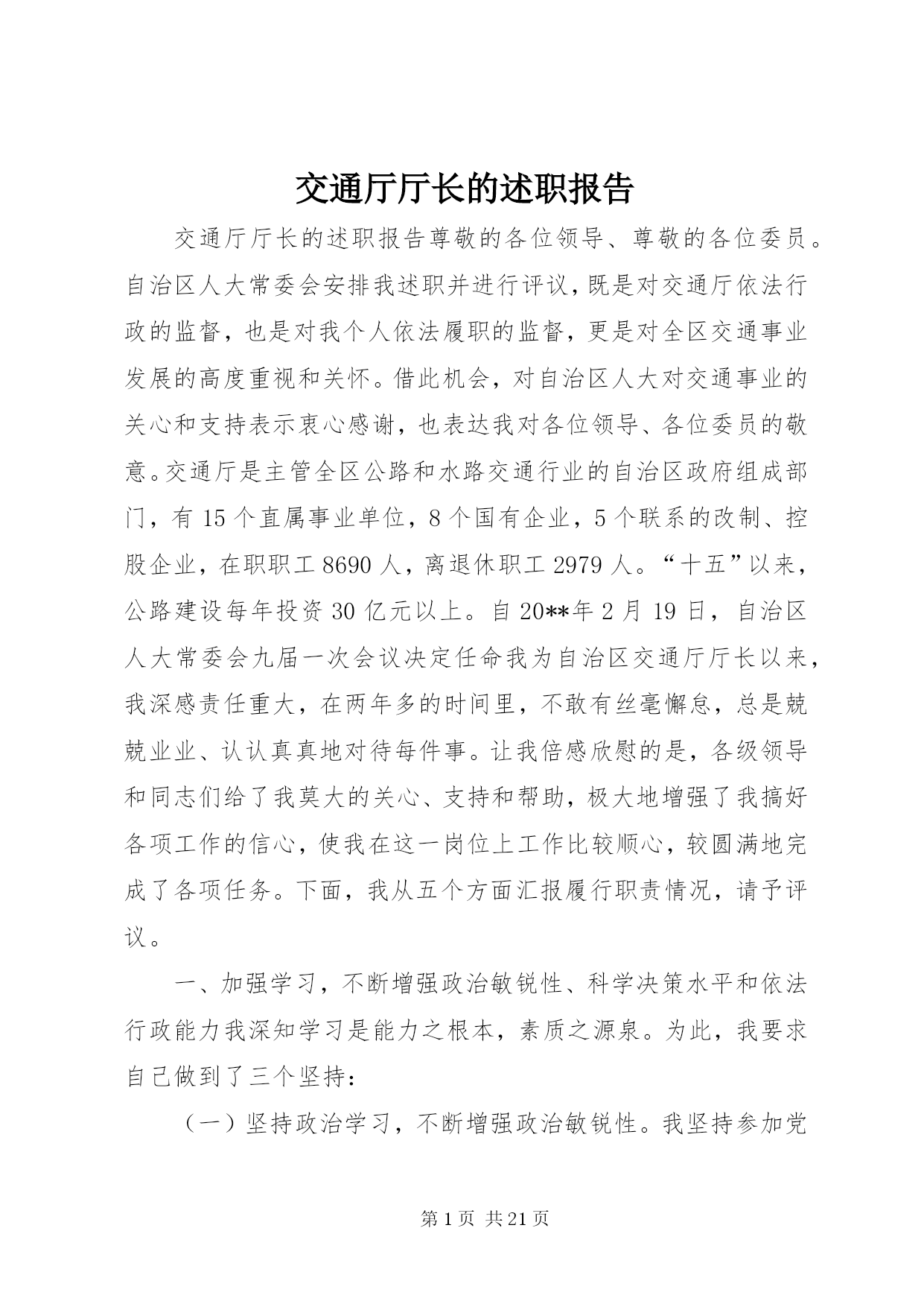 第PAGE\*Arabic\*MERGEFORMAT21页共NUMPAGES\*MERGEFORMAT21页交通厅厅长的述职报告交通厅厅长的述职报告尊敬的各位领导、尊敬的各位委员。自治区人大常委会安排我述职并进行评议,既是对交通厅依法行政的监督,也是对我个人依法履职的监督,更是对全区交通事业发展的高度重视和关怀。借此机会,对自治区人大对交通事业的关心和支持表示衷心感谢,也表达我对各位领导、各位委员的敬意。交通厅是主管全区公路和水路交通行业的自治区政府组成部门,有15个直属事业单位,8个国有企业