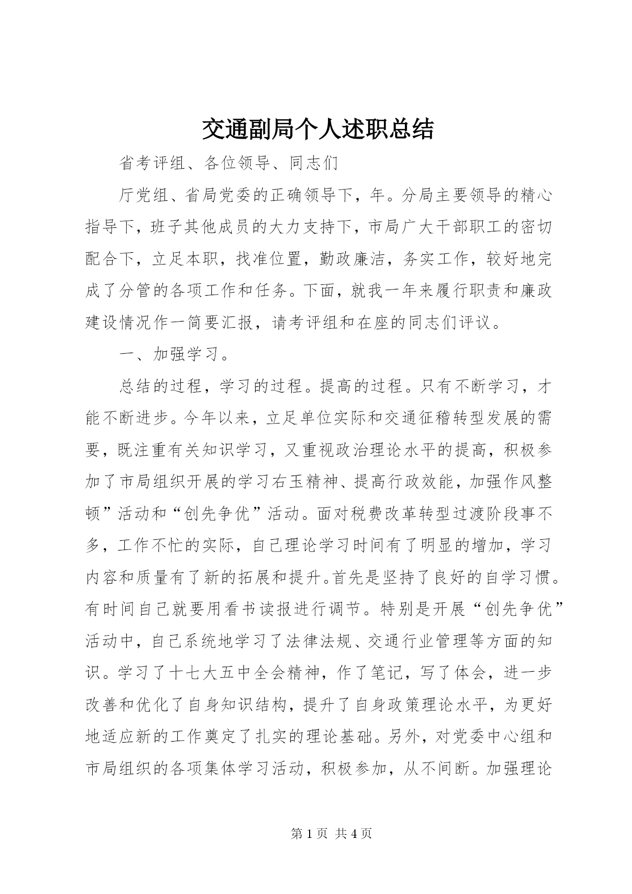 第PAGE\*Arabic\*MERGEFORMAT4页共NUMPAGES\*MERGEFORMAT4页交通副局个人述职总结省考评组、各位领导、同志们厅党组、省局党委的正确领导下,年。分局主要领导的精心指导下,班子其他成员的大力支持下,市局广大干部职工的密切配合下,立足本职,找准位置,勤政廉洁,务实工作,较好地完成了分管的各项工作和任务。下面,就我一年来履行职责和廉政建设情况作一简要汇报,请考评组和在座的同志们评议。一、加强学习。总结的过程,学习的过程。提高的过程。只有不断学习,才能不断进步。