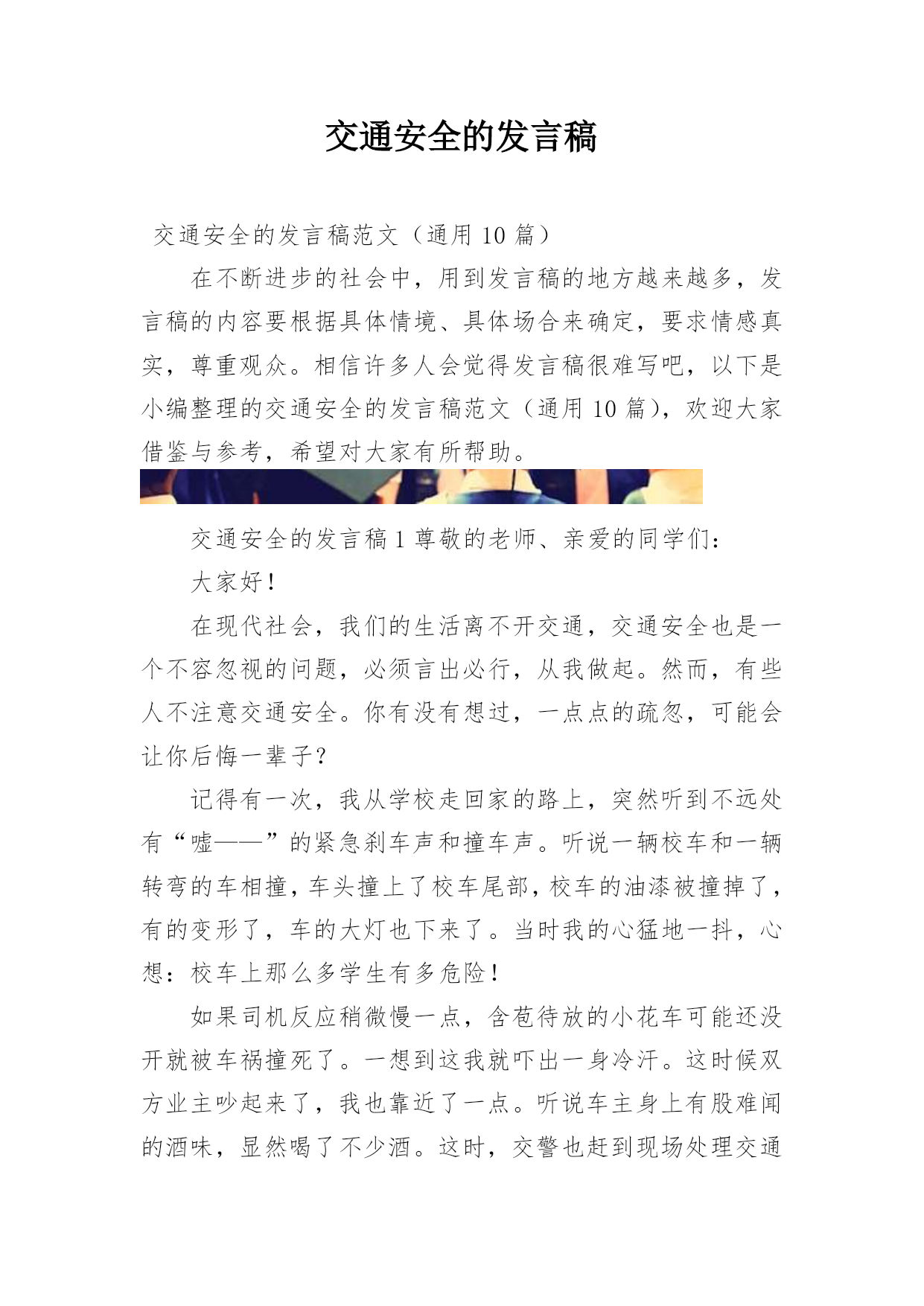 交通安全的发言稿交通安全的发言稿范文(通用10篇)在不断进步的社会中,用到发言稿的地方越来越多,发言稿的内容要根据具体情境、具体场合来确定,要求情感真实,尊重观众。相信许多人会觉得发言稿很难写吧,以下是小编整理的交通安全的发言稿范文(通用10篇),欢迎大家借鉴与参考,希望对大家有所帮助。交通安全的发言稿1尊敬的老师、亲爱的同学们:大家好!在现代社会,我们的生活离不开交通,交通安全也是一个不容忽视的问题,必须言出必行,从我做起。然而,有些人不注意交通安全。你有没有想过,一点点的疏忽,可能会让你后悔一辈子?记