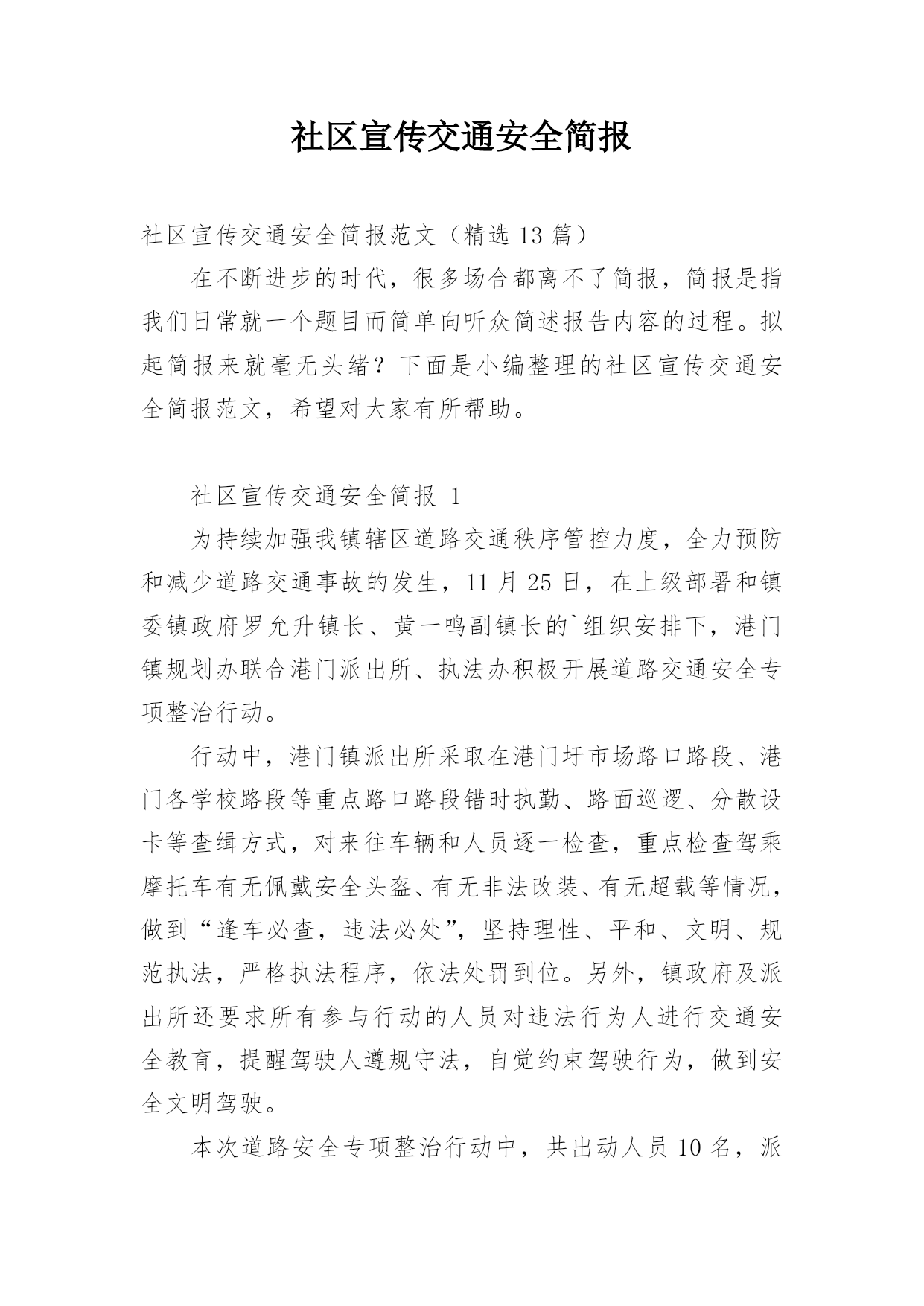 社区宣传交通安全简报社区宣传交通安全简报范文(精选13篇)在不断进步的时代,很多场合都离不了简报,简报是指我们日常就一个题目而简单向听众简述报告内容的过程。拟起简报来就毫无头绪?下面是小编整理的社区宣传交通安全简报范文,希望对大家有所帮助。社区宣传交通安全简报1为持续加强我镇辖区道路交通秩序管控力度,全力预防和减少道路交通事故的发生,11月25日,在上级部署和镇委镇政府罗允升镇长、黄一鸣副镇长的`组织安排下,港门镇规划办联合港门派出所、执法办积极开展道路交通安全专项整治行动。行动中,港门镇派出所采取在港门
