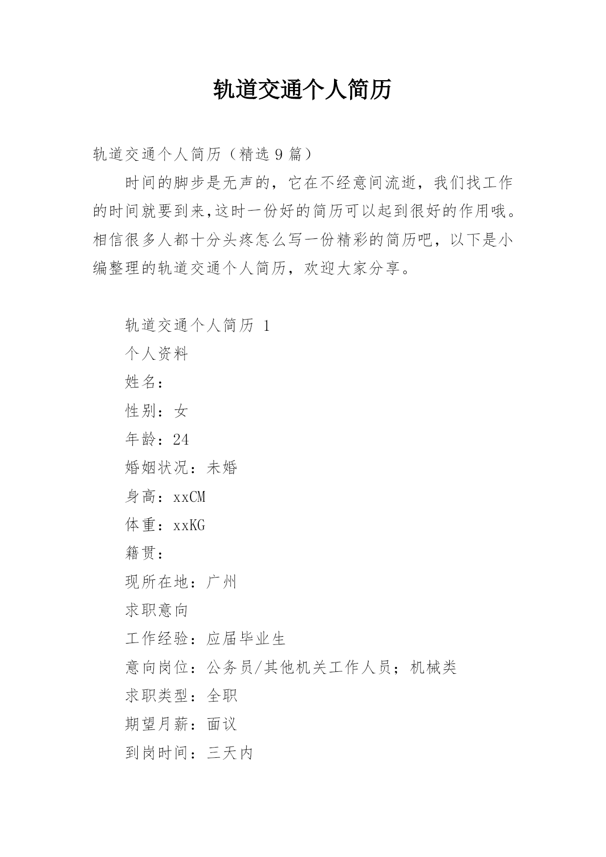 轨道交通个人简历轨道交通个人简历(精选9篇)时间的脚步是无声的,它在不经意间流逝,我们找工作的时间就要到来,这时一份好的简历可以起到很好的作用哦。相信很多人都十分头疼怎么写一份精彩的简历吧,以下是小编整理的轨道交通个人简历,欢迎大家分享。轨道交通个人简历1个人资料姓名:性别:女年龄:24婚姻状况:未婚身高:xxCM体重:xxKG籍贯:现所在地:广州求职意向工作经验:应届毕业生意向岗位:公务员/其他机关工作人员;机械类求职类型:全职期望月薪:面议到岗时间:三天内期望工作地点:其他要求:是客运中心的工作,本人