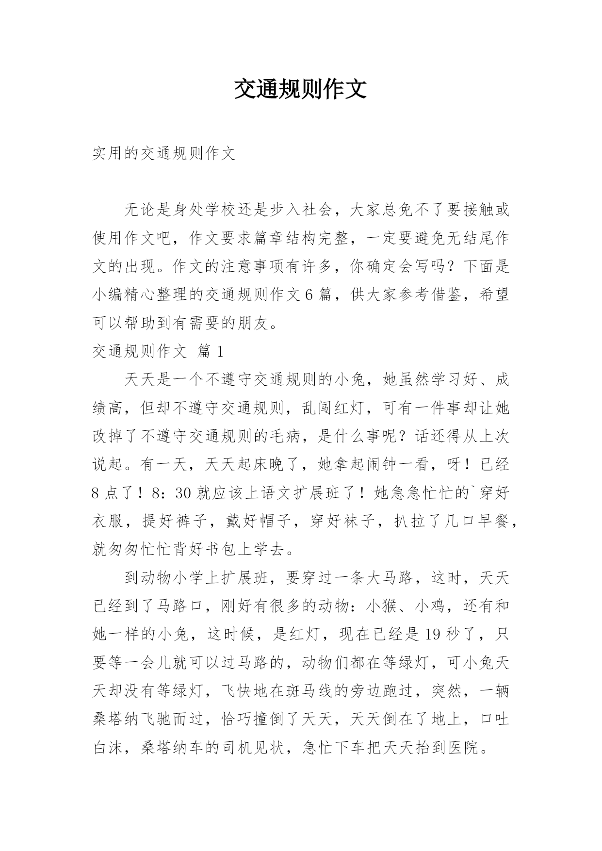交通规则作文实用的交通规则作文无论是身处学校还是步入社会,大家总免不了要接触或使用作文吧,作文要求篇章结构完整,一定要避免无结尾作文的出现。作文的注意事项有许多,你确定会写吗?下面是小编精心整理的交通规则作文6篇,供大家参考借鉴,希望可以帮助到有需要的朋友。交通规则作文篇1天天是一个不遵守交通规则的小兔,她虽然学习好、成绩高,但却不遵守交通规则,乱闯红灯,可有一件事却让她改掉了不遵守交通规则的毛病,是什么事呢?话还得从上次说起。有一天,天天起床晚了,她拿起闹钟一看,呀!已经8点了!8:30就应该上语文扩展