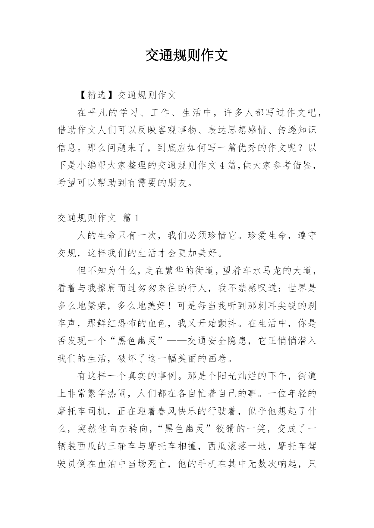 交通规则作文【精选】交通规则作文在平凡的学习、工作、生活中,许多人都写过作文吧,借助作文人们可以反映客观事物、表达思想感情、传递知识信息。那么问题来了,到底应如何写一篇优秀的作文呢?以下是小编帮大家整理的交通规则作文4篇,供大家参考借鉴,希望可以帮助到有需要的朋友。交通规则作文篇1人的生命只有一次,我们必须珍惜它。珍爱生命,遵守交规,这样我们的生活才会更加美好。但不知为什么,走在繁华的街道,望着车水马龙的大道,看着与我擦肩而过匆匆来往的行人,我不禁感叹道:世界是多么地繁荣,多么地美好!可是每当我听到那刺耳