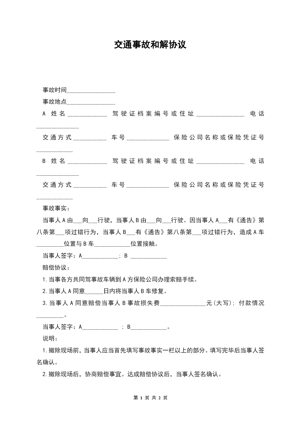 第PAGE\*MERGEFORMAT2页共NUMPAGES\*MERGEFORMAT2页交通事故和解协议事故时间________________事故地点________________A姓名_____________驾驶证档案编号或住址________________电话______________交通方式___________车号______________保险公司名称或保险凭证号____________B姓名_____________驾驶证档案编号或住址________________电话