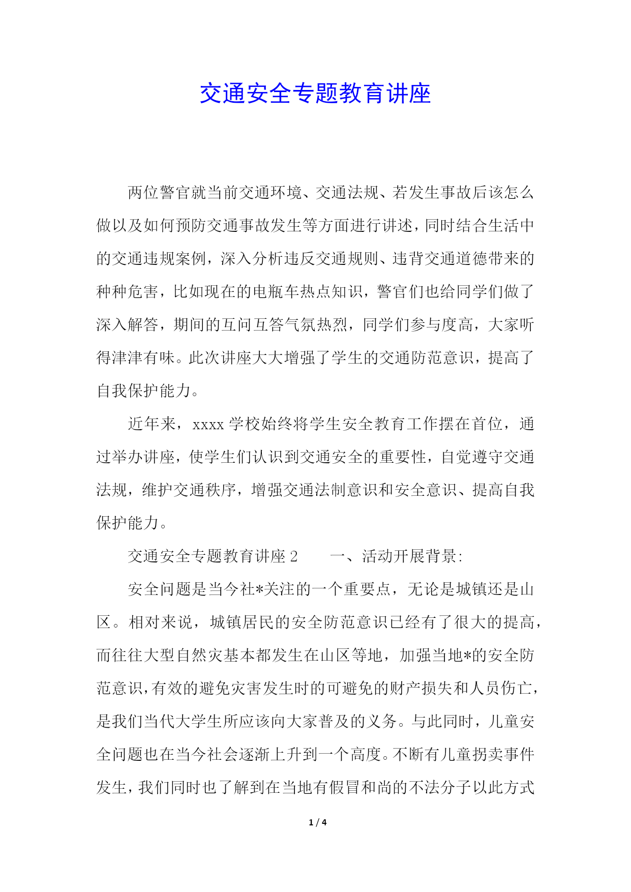 PAGE4/NUMPAGES4交通安全专题教育讲座两位警官就当前交通环境、交通法规、若发生事故后该怎么做以及如何预防交通事故发生等方面进行讲述,同时结合生活中的交通违规案例,深入分析违反交通规则、违背交通道德带来的种种危害,比如现在的电瓶车热点知识,警官们也给同学们做了深入解答,期间的互问互答气氛热烈,同学们参与度高,大家听得津津有味。此次讲座大大增强了学生的交通防范意识,提高了自我保护能力。近年来,xxxx学校始终将学生安全教育工作摆在首位,通过举办讲座,使学生们认识到交通安全的重要性,自觉