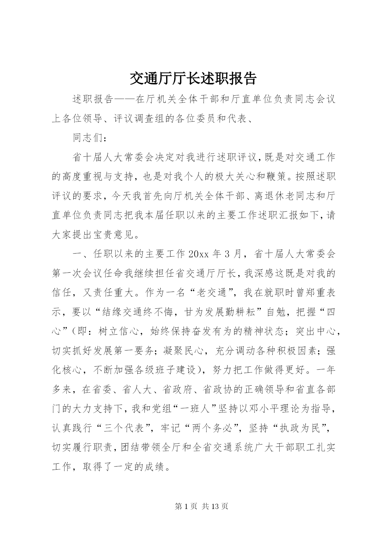 第PAGE\*Arabic\*MERGEFORMAT13页共NUMPAGES\*MERGEFORMAT13页交通厅厅长述职报告述职报告——在厅机关全体干部和厅直单位负责同志会议上各位领导、评议调查组的各位委员和代表、同志们:省十届人大常委会决定对我进行述职评议,既是对交通工作的高度重视与支持,也是对我个人的极大关心和鞭策。按照述职评议的要求,今天我首先向厅机关全体干部、离退休老同志和厅直单位负责同志把我本届任职以来的主要工作述职汇报如下,请大家提出宝贵意见。一、任职以来的主要工作20xx年3月