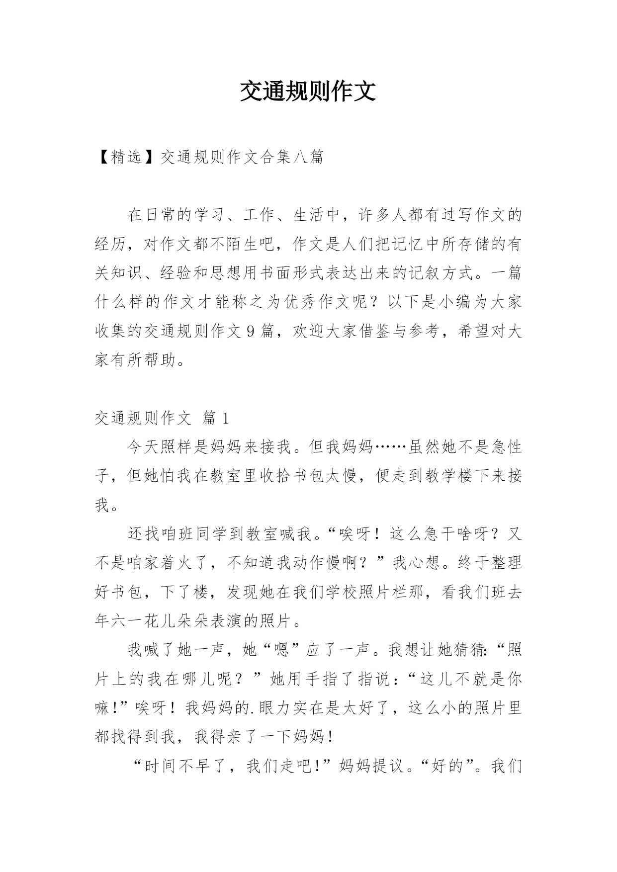 交通规则作文【精选】交通规则作文合集八篇在日常的学习、工作、生活中,许多人都有过写作文的经历,对作文都不陌生吧,作文是人们把记忆中所存储的有关知识、经验和思想用书面形式表达出来的记叙方式。一篇什么样的作文才能称之为优秀作文呢?以下是小编为大家收集的交通规则作文9篇,欢迎大家借鉴与参考,希望对大家有所帮助。交通规则作文篇1今天照样是妈妈来接我。但我妈妈……虽然她不是急性子,但她怕我在教室里收拾书包太慢,便走到教学楼下来接我。还找咱班同学到教室喊我。“唉呀!这么急干啥呀?又不是咱家着火了,不知道我动作慢啊?”