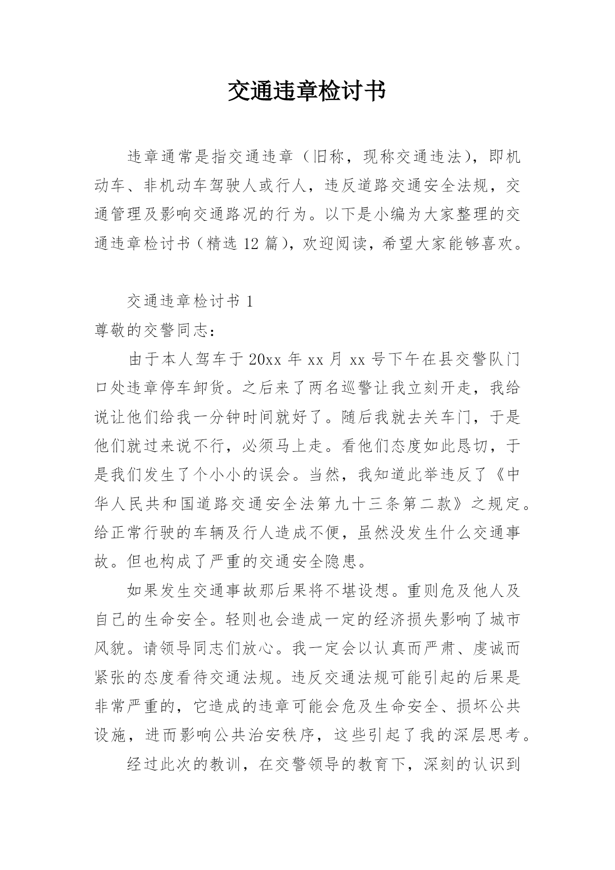 交通违章检讨书违章通常是指交通违章(旧称,现称交通违法),即机动车、非机动车驾驶人或行人,违反道路交通安全法规,交通管理及影响交通路况的行为。以下是小编为大家整理的交通违章检讨书(精选12篇),欢迎阅读,希望大家能够喜欢。交通违章检讨书1尊敬的交警同志:由于本人驾车于20xx年xx月xx号下午在县交警队门口处违章停车卸货。之后来了两名巡警让我立刻开走,我给说让他们给我一分钟时间就好了。随后我就去关车门,于是他们就过来说不行,必须马上走。看他们态度如此恳切,于是我们发生了个小小的误会。当然,我知道此举违反了