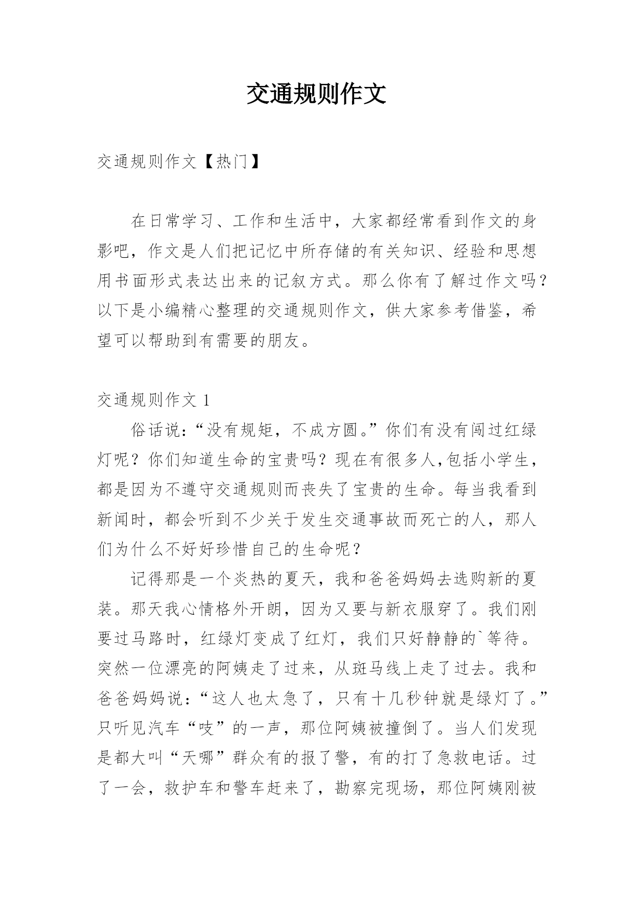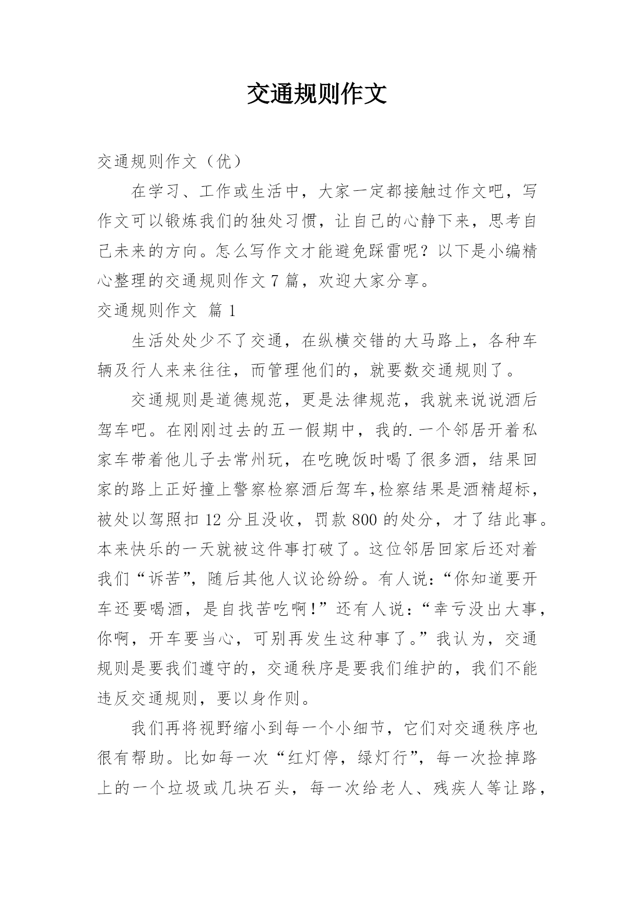 交通规则作文交通规则作文(优)在学习、工作或生活中,大家一定都接触过作文吧,写作文可以锻炼我们的独处习惯,让自己的心静下来,思考自己未来的方向。怎么写作文才能避免踩雷呢?以下是小编精心整理的交通规则作文7篇,欢迎大家分享。交通规则作文篇1生活处处少不了交通,在纵横交错的大马路上,各种车辆及行人来来往往,而管理他们的,就要数交通规则了。交通规则是道德规范,更是法律规范,我就来说说酒后驾车吧。在刚刚过去的五一假期中,我的.一个邻居开着私家车带着他儿子去常州玩,在吃晚饭时喝了很多酒,结果回家的路上正好撞上警察检