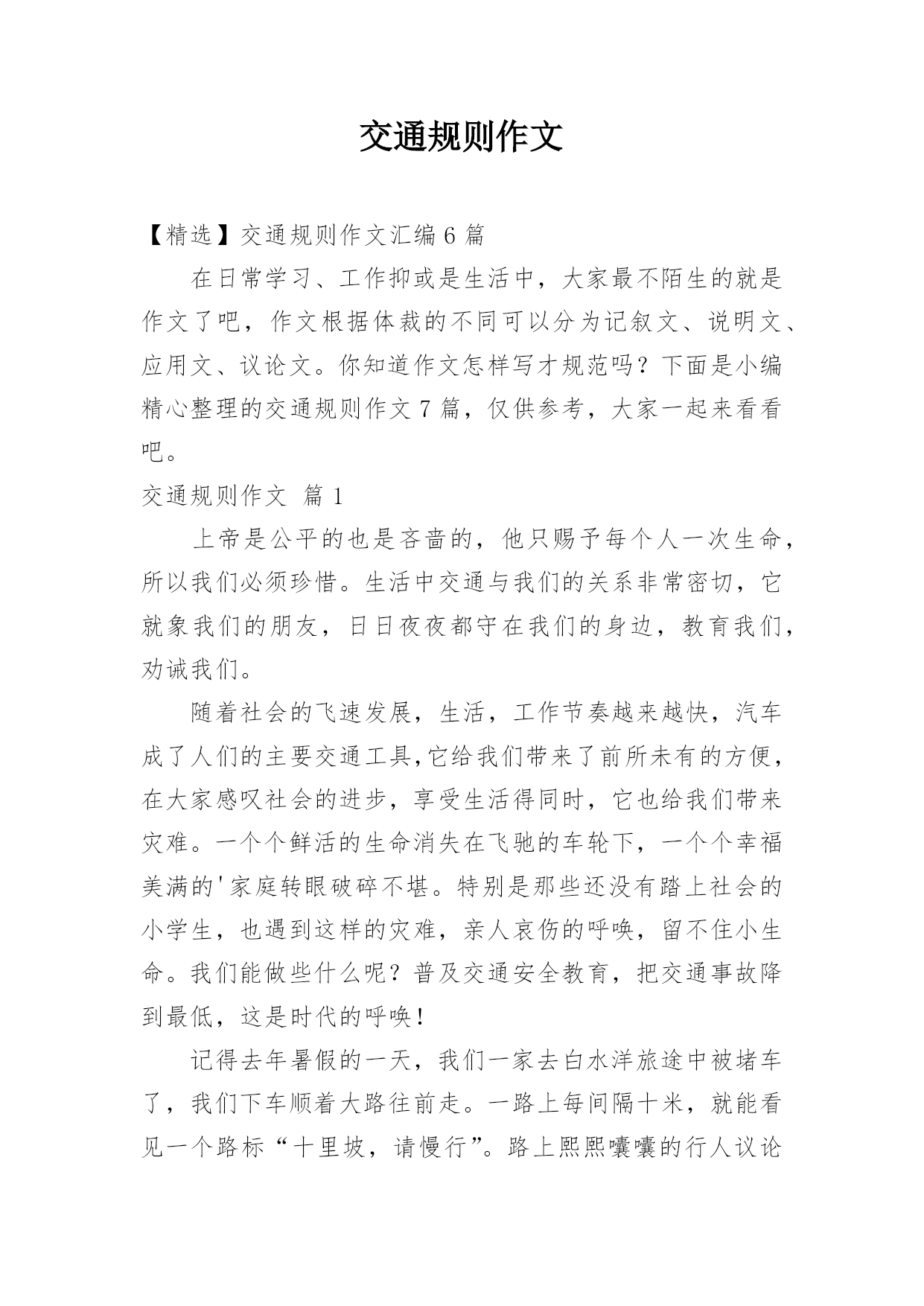 交通规则作文【精选】交通规则作文汇编6篇在日常学习、工作抑或是生活中,大家最不陌生的就是作文了吧,作文根据体裁的不同可以分为记叙文、说明文、应用文、议论文。你知道作文怎样写才规范吗?下面是小编精心整理的交通规则作文7篇,仅供参考,大家一起来看看吧。交通规则作文篇1上帝是公平的也是吝啬的,他只赐予每个人一次生命,所以我们必须珍惜。生活中交通与我们的关系非常密切,它就象我们的朋友,日日夜夜都守在我们的身边,教育我们,劝诫我们。随着社会的飞速发展,生活,工作节奏越来越快,汽车成了人们的主要交通工具,它给我们带来