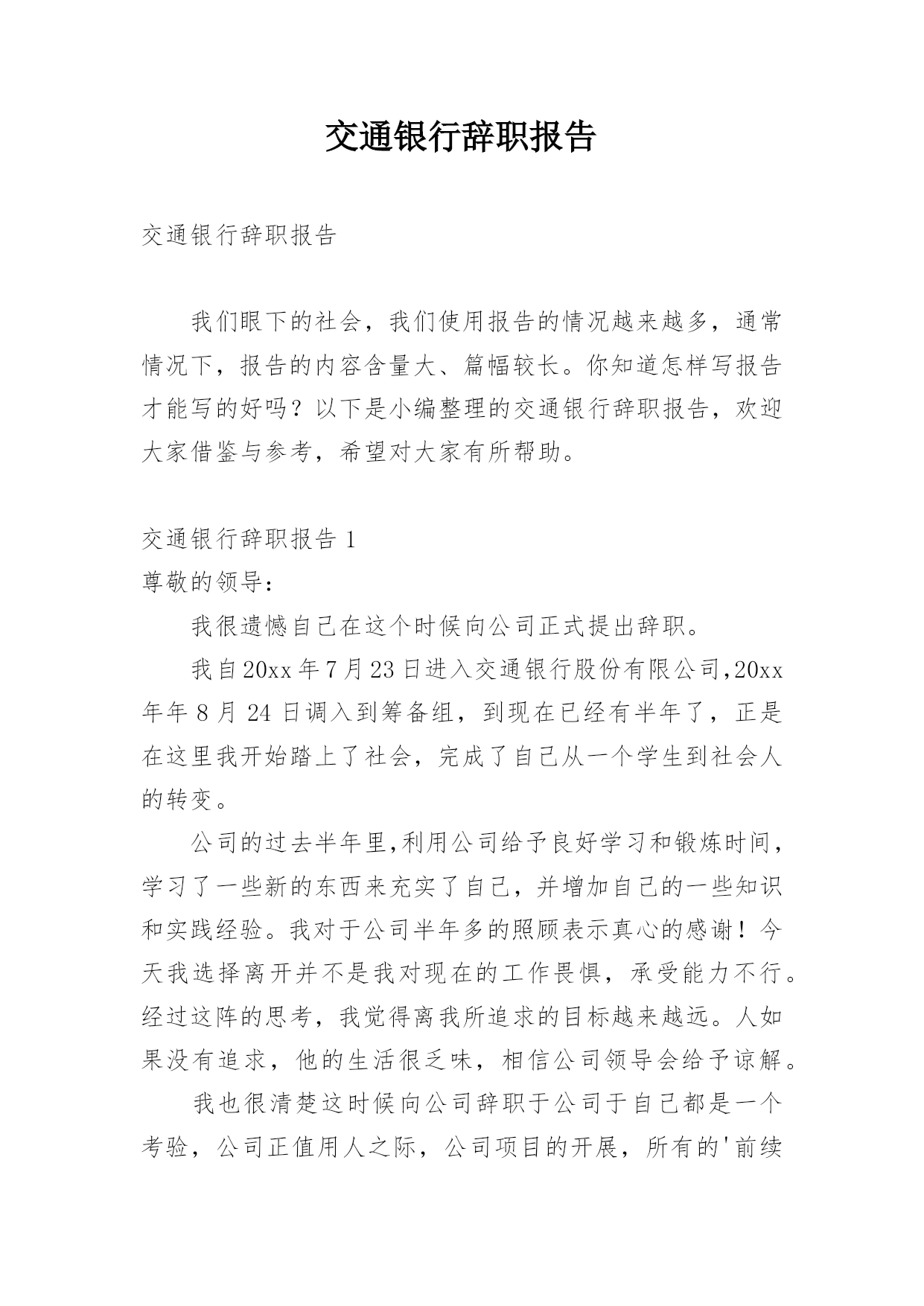 交通银行辞职报告交通银行辞职报告我们眼下的社会,我们使用报告的情况越来越多,通常情况下,报告的内容含量大、篇幅较长。你知道怎样写报告才能写的好吗?以下是小编整理的交通银行辞职报告,欢迎大家借鉴与参考,希望对大家有所帮助。交通银行辞职报告1尊敬的领导:我很遗憾自己在这个时候向公司正式提出辞职。我自20xx年7月23日进入交通银行股份有限公司,20xx年年8月24日调入到筹备组,到现在已经有半年了,正是在这里我开始踏上了社会,完成了自己从一个学生到社会人的转变。公司的过去半年里,利用公司给予良好学习和锻炼时间