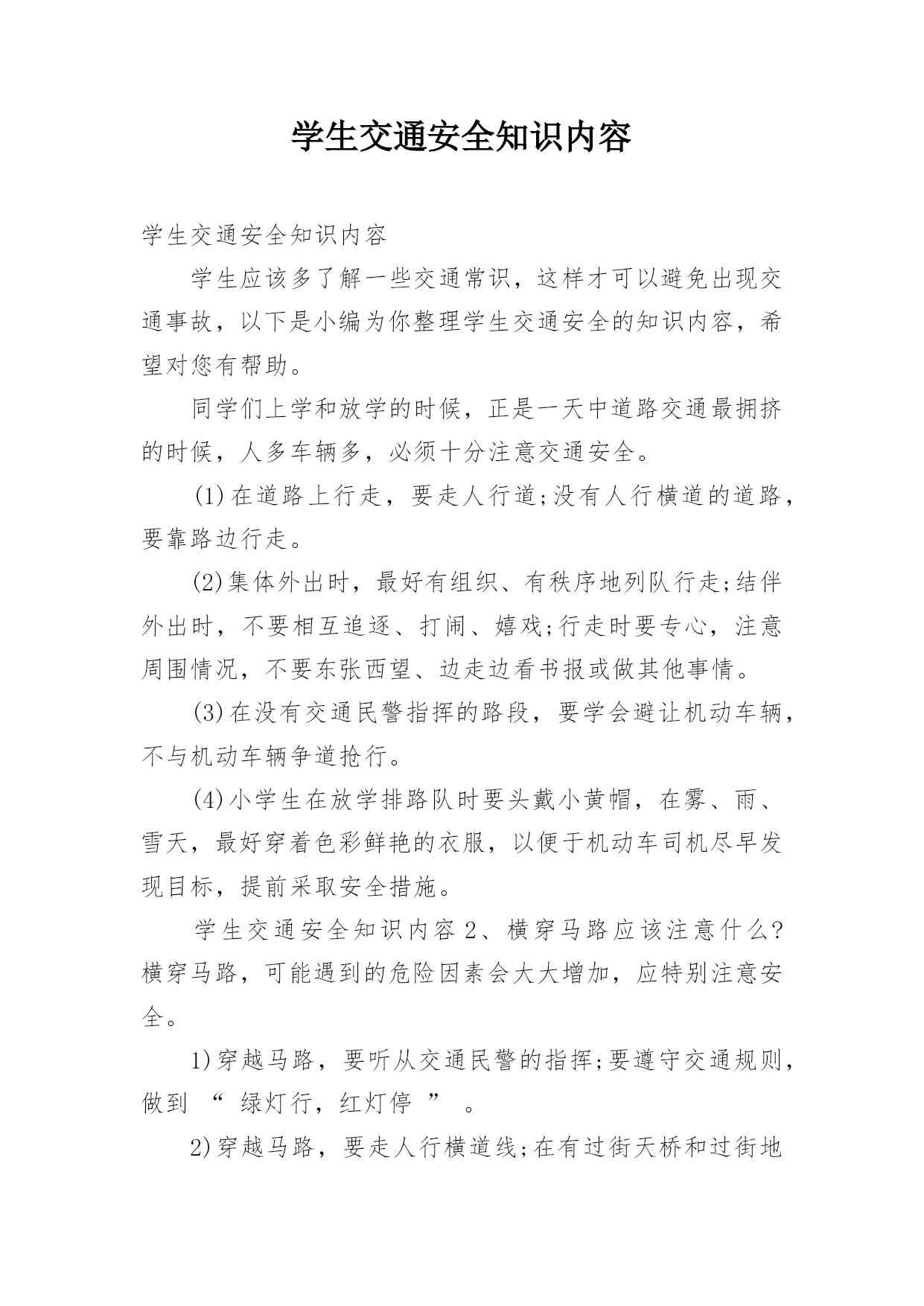 学生交通安全知识内容学生交通安全知识内容学生应该多了解一些交通常识,这样才可以避免出现交通事故,以下是小编为你整理学生交通安全的知识内容,希望对您有帮助。同学们上学和放学的时候,正是一天中道路交通最拥挤的时候,人多车辆多,必须十分注意交通安全。(1)在道路上行走,要走人行道;没有人行横道的道路,要靠路边行走。(2)集体外出时,最好有组织、有秩序地列队行走;结伴外出时,不要相互追逐、打闹、嬉戏;行走时要专心,注意周围情况,不要东张西望、边走边看书报或做其他事情。(3)在没有交通民警指挥的路段,要学会避让机动