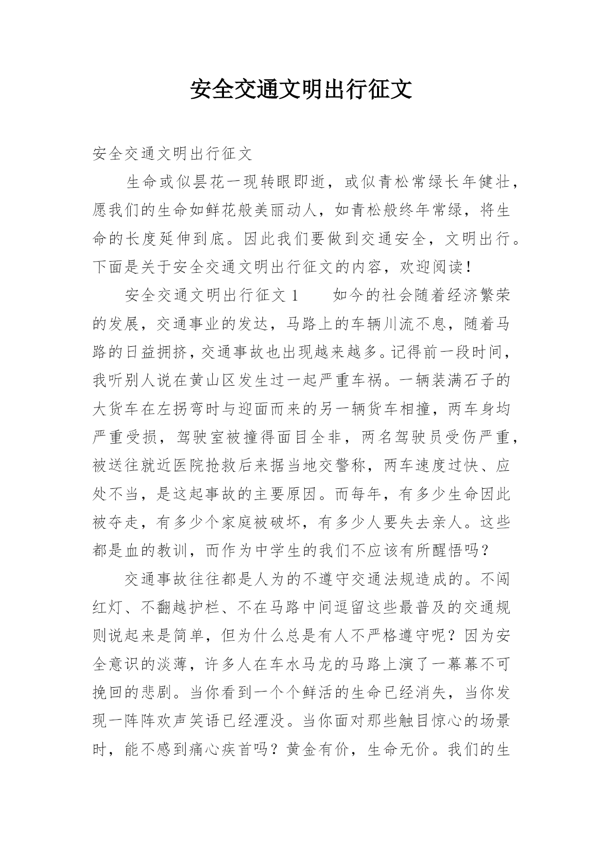 安全交通文明出行征文安全交通文明出行征文生命或似昙花一现转眼即逝,或似青松常绿长年健壮,愿我们的生命如鲜花般美丽动人,如青松般终年常绿,将生命的长度延伸到底。因此我们要做到交通安全,文明出行。下面是关于安全交通文明出行征文的内容,欢迎阅读!安全交通文明出行征文1如今的社会随着经济繁荣的发展,交通事业的发达,马路上的车辆川流不息,随着马路的日益拥挤,交通事故也出现越来越多。记得前一段时间,我听别人说在黄山区发生过一起严重车祸。一辆装满石子的大货车在左拐弯时与迎面而来的另一辆货车相撞,两车身均严重受损,驾驶室