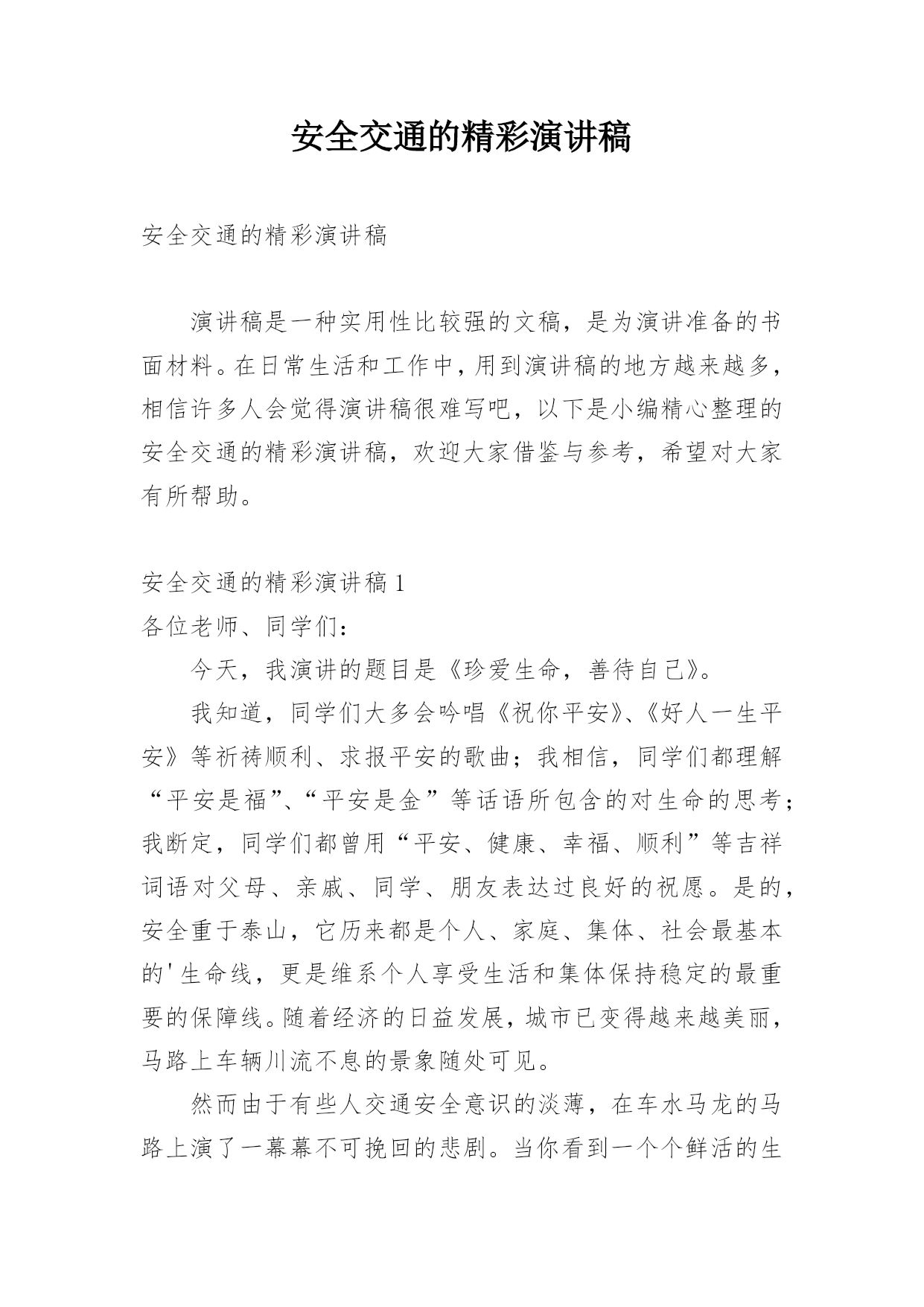 安全交通的精彩演讲稿安全交通的精彩演讲稿演讲稿是一种实用性比较强的文稿,是为演讲准备的书面材料。在日常生活和工作中,用到演讲稿的地方越来越多,相信许多人会觉得演讲稿很难写吧,以下是小编精心整理的安全交通的精彩演讲稿,欢迎大家借鉴与参考,希望对大家有所帮助。安全交通的精彩演讲稿1各位老师、同学们:今天,我演讲的题目是《珍爱生命,善待自己》。我知道,同学们大多会吟唱《祝你平安》、《好人一生平安》等祈祷顺利、求报平安的歌曲;我相信,同学们都理解“平安是福”、“平安是金”等话语所包含的对生命的思考;我断定,同学们
