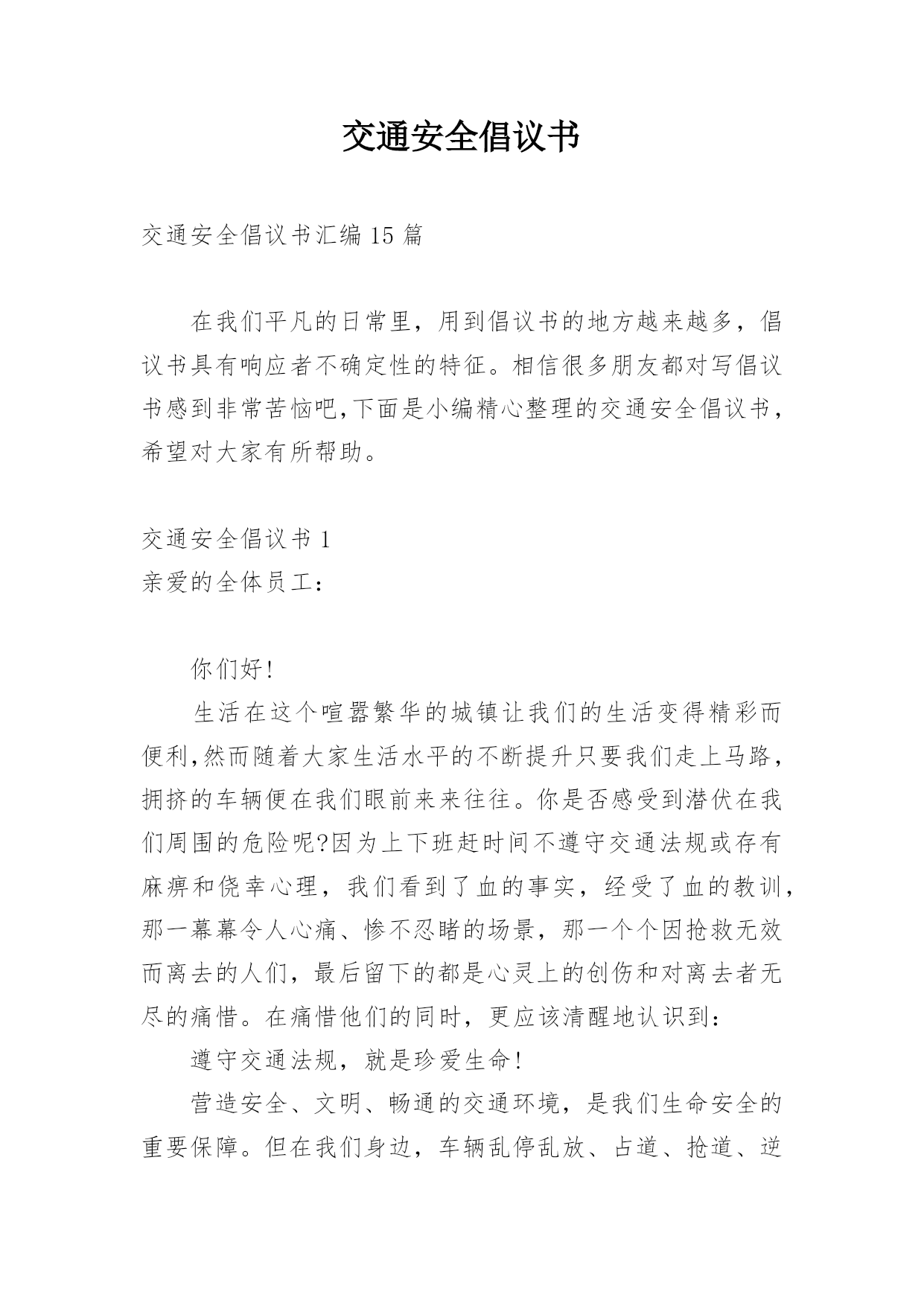 交通安全倡议书交通安全倡议书汇编15篇在我们平凡的日常里,用到倡议书的地方越来越多,倡议书具有响应者不确定性的特征。相信很多朋友都对写倡议书感到非常苦恼吧,下面是小编精心整理的交通安全倡议书,希望对大家有所帮助。交通安全倡议书1亲爱的全体员工:你们好!生活在这个喧嚣繁华的城镇让我们的生活变得精彩而便利,然而随着大家生活水平的不断提升只要我们走上马路,拥挤的车辆便在我们眼前来来往往。你是否感受到潜伏在我们周围的危险呢?因为上下班赶时间不遵守交通法规或存有麻痹和侥幸心理,我们看到了血的事实,经受了血的教训,那