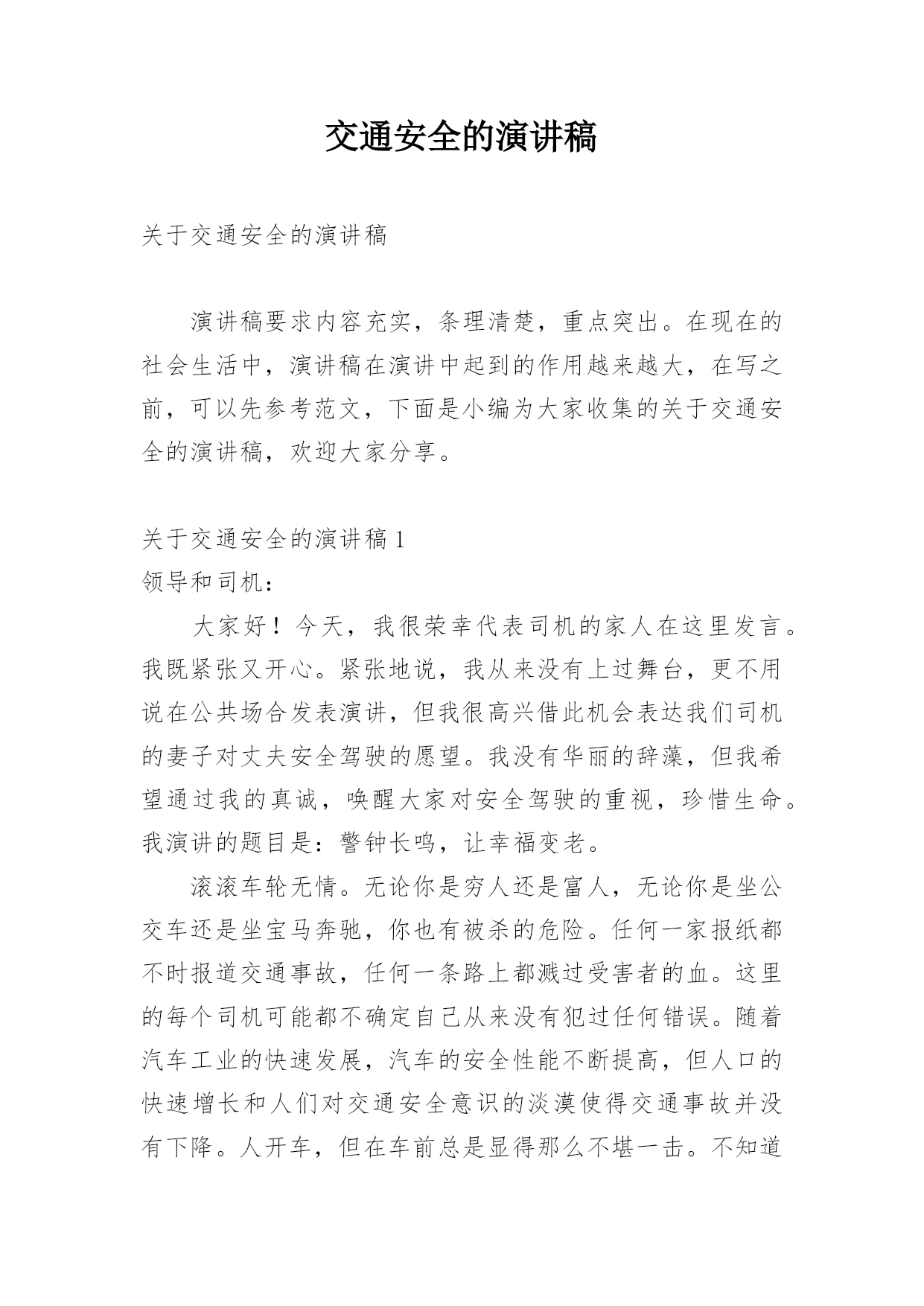 交通安全的演讲稿关于交通安全的演讲稿演讲稿要求内容充实,条理清楚,重点突出。在现在的社会生活中,演讲稿在演讲中起到的作用越来越大,在写之前,可以先参考范文,下面是小编为大家收集的关于交通安全的演讲稿,欢迎大家分享。关于交通安全的演讲稿1领导和司机:大家好!今天,我很荣幸代表司机的家人在这里发言。我既紧张又开心。紧张地说,我从来没有上过舞台,更不用说在公共场合发表演讲,但我很高兴借此机会表达我们司机的妻子对丈夫安全驾驶的愿望。我没有华丽的辞藻,但我希望通过我的真诚,唤醒大家对安全驾驶的重视,珍惜生命。我演讲