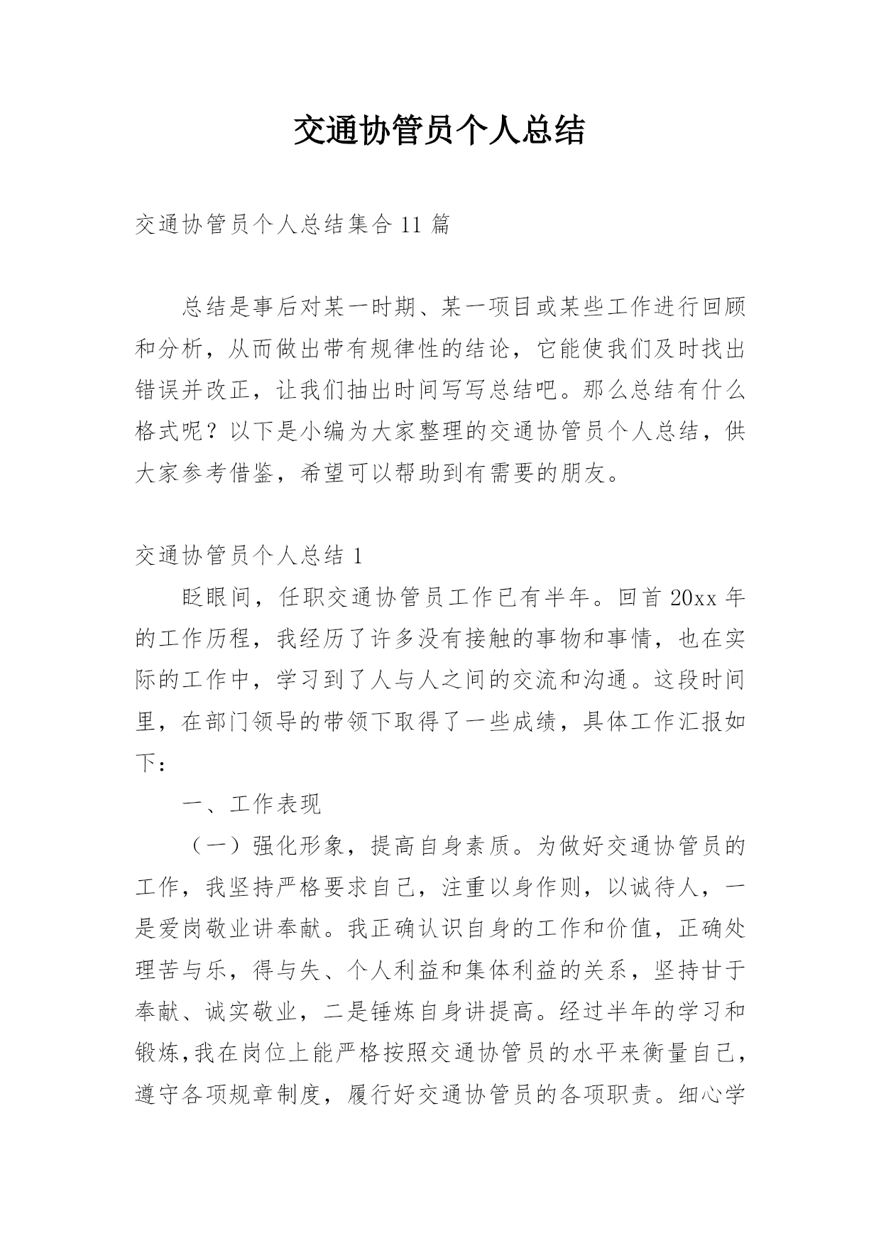 交通协管员个人总结交通协管员个人总结集合11篇总结是事后对某一时期、某一项目或某些工作进行回顾和分析,从而做出带有规律性的结论,它能使我们及时找出错误并改正,让我们抽出时间写写总结吧。那么总结有什么格式呢?以下是小编为大家整理的交通协管员个人总结,供大家参考借鉴,希望可以帮助到有需要的朋友。交通协管员个人总结1眨眼间,任职交通协管员工作已有半年。回首20xx年的工作历程,我经历了许多没有接触的事物和事情,也在实际的工作中,学习到了人与人之间的交流和沟通。这段时间里,在部门领导的带领下取得了一些成绩,具体工