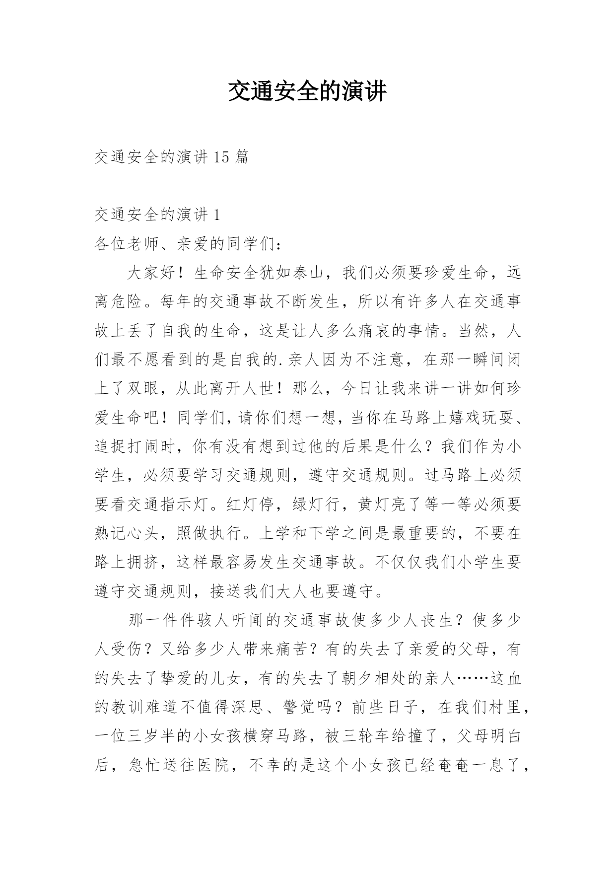 交通安全的演讲交通安全的演讲15篇交通安全的演讲1各位老师、亲爱的同学们:大家好!生命安全犹如泰山,我们必须要珍爱生命,远离危险。每年的交通事故不断发生,所以有许多人在交通事故上丢了自我的生命,这是让人多么痛哀的事情。当然,人们最不愿看到的是自我的.亲人因为不注意,在那一瞬间闭上了双眼,从此离开人世!那么,今日让我来讲一讲如何珍爱生命吧!同学们,请你们想一想,当你在马路上嬉戏玩耍、追捉打闹时,你有没有想到过他的后果是什么?我们作为小学生,必须要学习交通规则,遵守交通规则。过马路上必须要看交通指示灯。红灯停