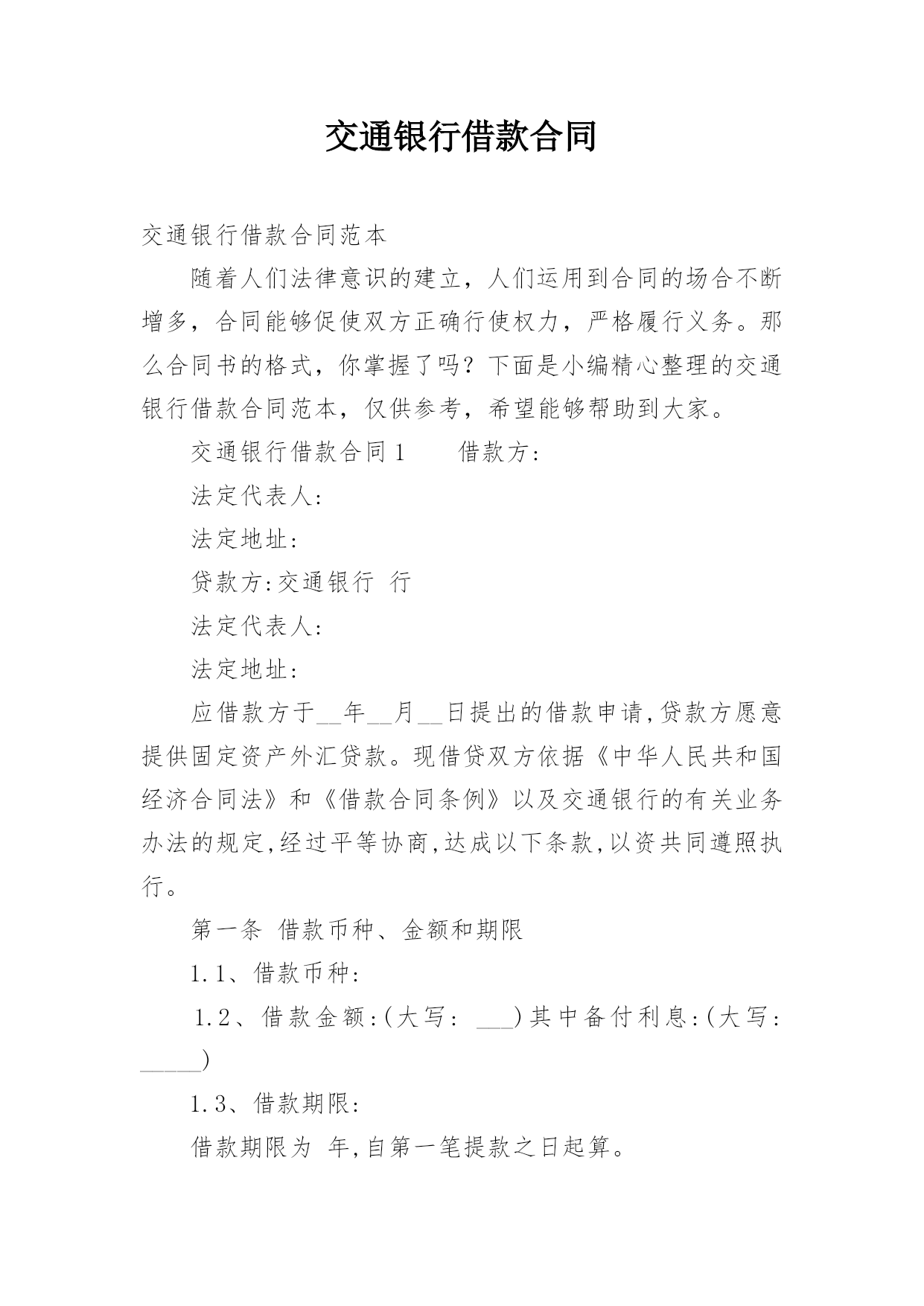 交通银行借款合同交通银行借款合同范本随着人们法律意识的建立,人们运用到合同的场合不断增多,合同能够促使双方正确行使权力,严格履行义务。那么合同书的格式,你掌握了吗?下面是小编精心整理的交通银行借款合同范本,仅供参考,希望能够帮助到大家。交通银行借款合同1借款方:法定代表人:法定地址:贷款方:交通银行行法定代表人:法定地址:应借款方于__年__月__日提出的借款申请,贷款方愿意提供固定资产外汇贷款。现借贷双方依据《中华人民共和国经济合同法》和《借款合同条例》以及交通银行的有关业务办法的规定,经过平等协商,达