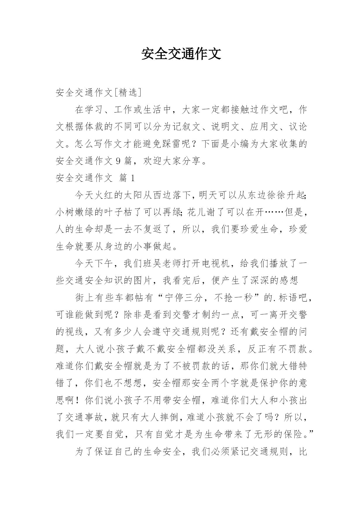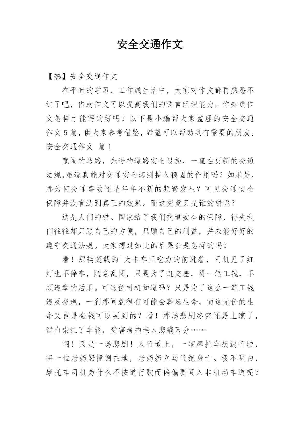 安全交通作文【热】安全交通作文在平时的学习、工作或生活中,大家对作文都再熟悉不过了吧,借助作文可以提高我们的语言组织能力。你知道作文怎样才能写的好吗?以下是小编帮大家整理的安全交通作文5篇,供大家参考借鉴,希望可以帮助到有需要的朋友。安全交通作文篇1宽阔的马路,先进的道路安全设施,一直在更新的交通法规,难道真能对交通安全起到持久稳固的作用吗?如果是,那为何交通事故还是年年不断的频繁发生?可见交通安全保障并没有达到真正的效果。而这究竟又是谁的错呢?这是人们的错。国家给了我们交通安全的保障,得失我们往往却只顾
