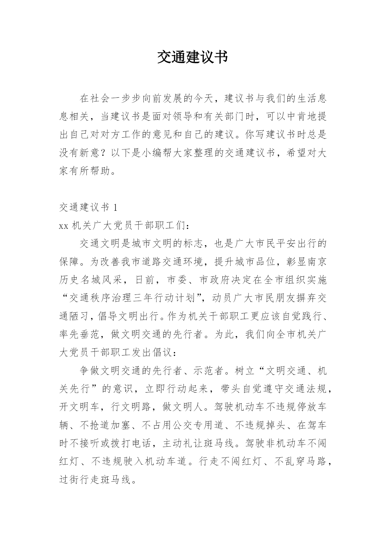 交通建议书在社会一步步向前发展的今天,建议书与我们的生活息息相关,当建议书是面对领导和有关部门时,可以中肯地提出自己对对方工作的意见和自己的建议。你写建议书时总是没有新意?以下是小编帮大家整理的交通建议书,希望对大家有所帮助。交通建议书1xx机关广大党员干部职工们:交通文明是城市文明的标志,也是广大市民平安出行的保障。为改善我市道路交通环境,提升城市品位,彰显南京历史名城风采,日前,市委、市政府决定在全市组织实施“交通秩序治理三年行动计划”,动员广大市民朋友摒弃交通陋习,倡导文明出行。作为机关干部职工更应