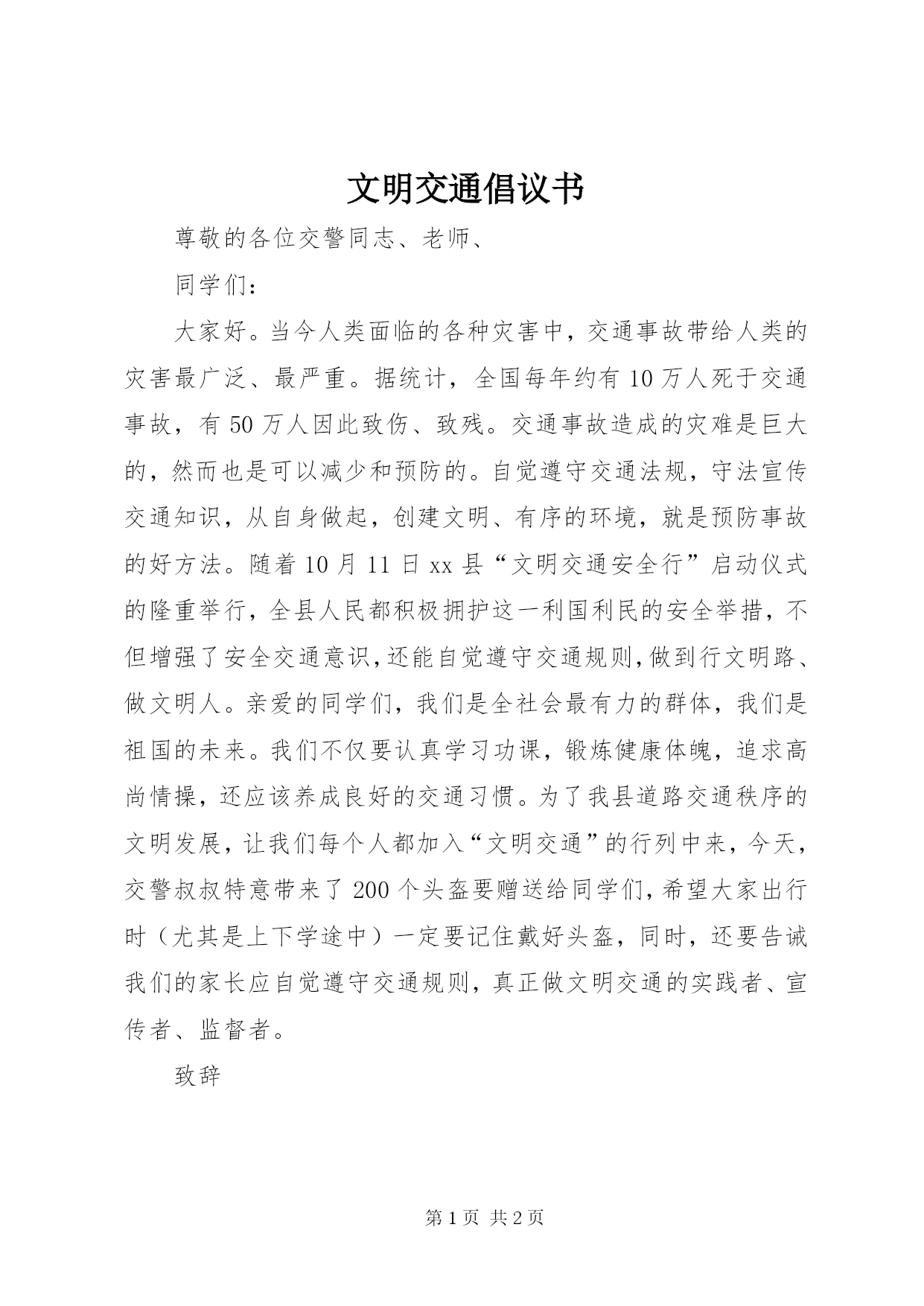 第PAGE\*Arabic\*MERGEFORMAT2页共NUMPAGES\*MERGEFORMAT2页文明交通倡议书尊敬的各位交警同志、老师、同学们:大家好。当今人类面临的各种灾害中,交通事故带给人类的灾害最广泛、最严重。据统计,全国每年约有10万人死于交通事故,有50万人因此致伤、致残。交通事故造成的灾难是巨大的,然而也是可以减少和预防的。自觉遵守交通法规,守法宣传交通知识,从自身做起,创建文明、有序的环境,就是预防事故的好方法。随着10月11日xx县“文明交通安全行”启动仪式的隆重举行,