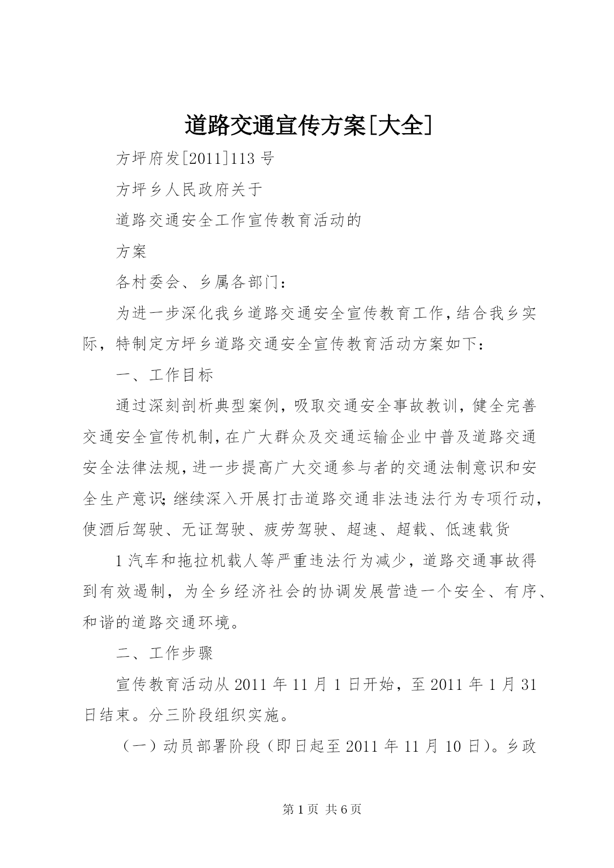 第PAGE\*Arabic\*MERGEFORMAT6页共NUMPAGES\*MERGEFORMAT6页道路交通宣传方案[大全]方坪府发[2011]113号方坪乡人民政府关于道路交通安全工作宣传教育活动的方案各村委会、乡属各部门:为进一步深化我乡道路交通安全宣传教育工作,结合我乡实际,特制定方坪乡道路交通安全宣传教育活动方案如下:一、工作目标通过深刻剖析典型案例,吸取交通安全事故教训,健全完善交通安全宣传机制,在广大群众及交通运输企业中普及道路交通安全法律法规,进一步提高广大交通参与者的交通法